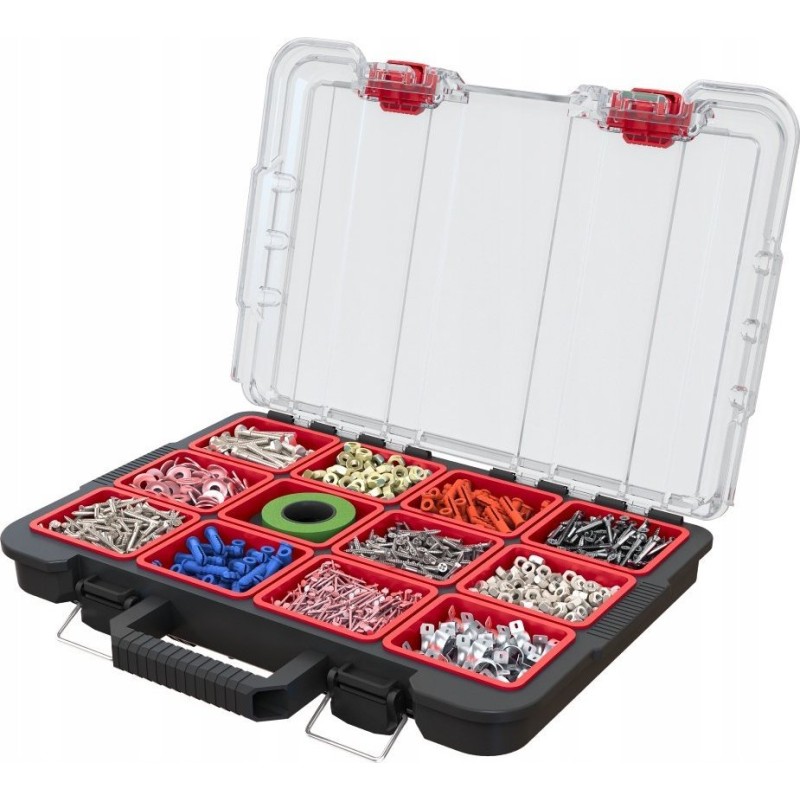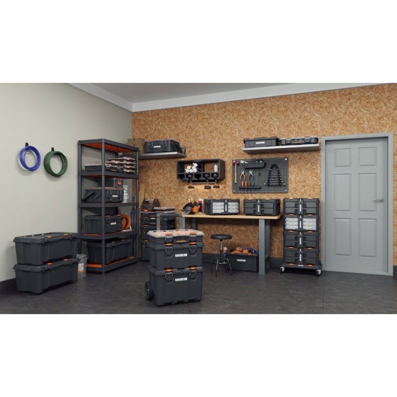 Das große Fassungsvermögen ermöglicht eine einfache Organisation aller Arten von Werkstattwerkzeugen, darunter Steckschlüsselsätze, Schraubendreher, Inbusschlüssel sowie größere Elektrowerkzeuge wie Bohrmaschinen oder Stichsägen.