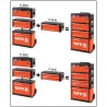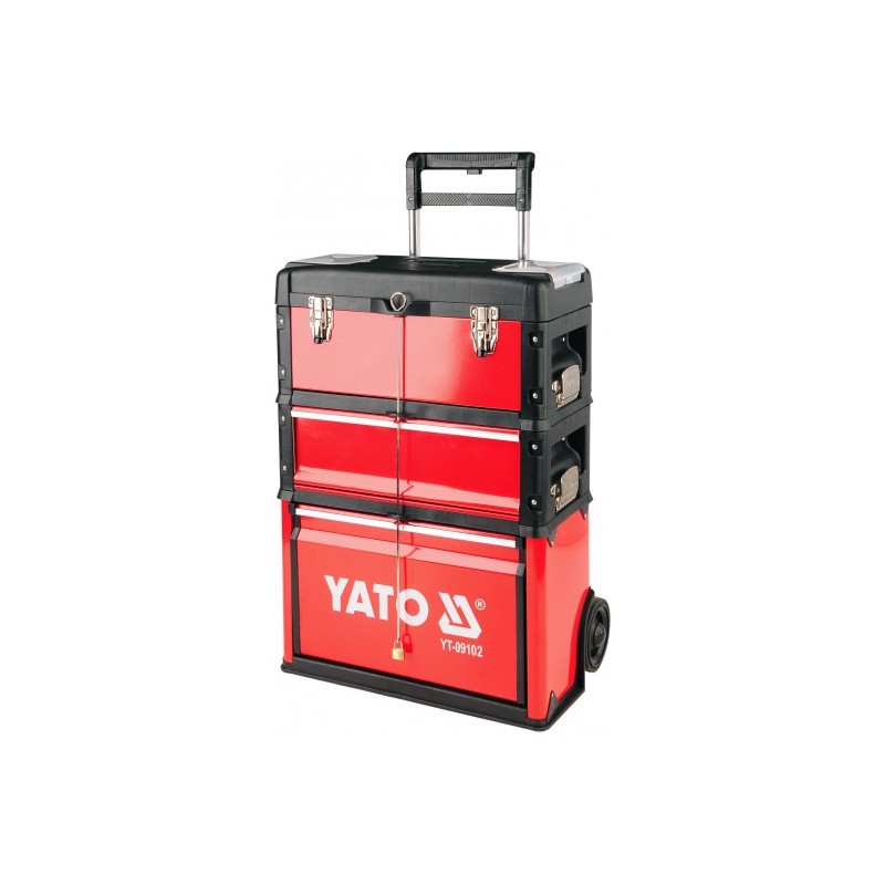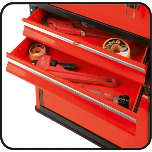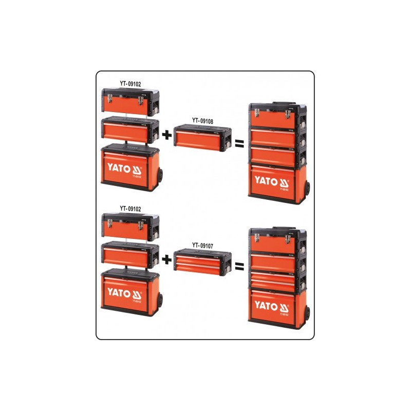 Es besteht die Möglichkeit, das 3-Modul-Set zu einem 4-Modul-Set zu erweitern, indem das Mittelmodul YT-09107 oder YT-09108 hinzugefügt wird. Die oberen und mittleren Module verfügen über Metallverschlüsse zum Zusammenfügen zu Sets, und der Aluminiumgriff ist zusätzlich mit einer Verriegelung ausgestattet, die die Module sichert. In die Schubladen können YATO-Werkzeugtrays mit vorgefertigten Werkzeugsätzen eingesetzt werden.