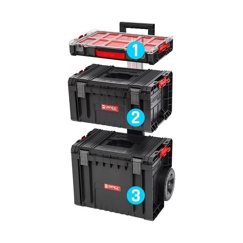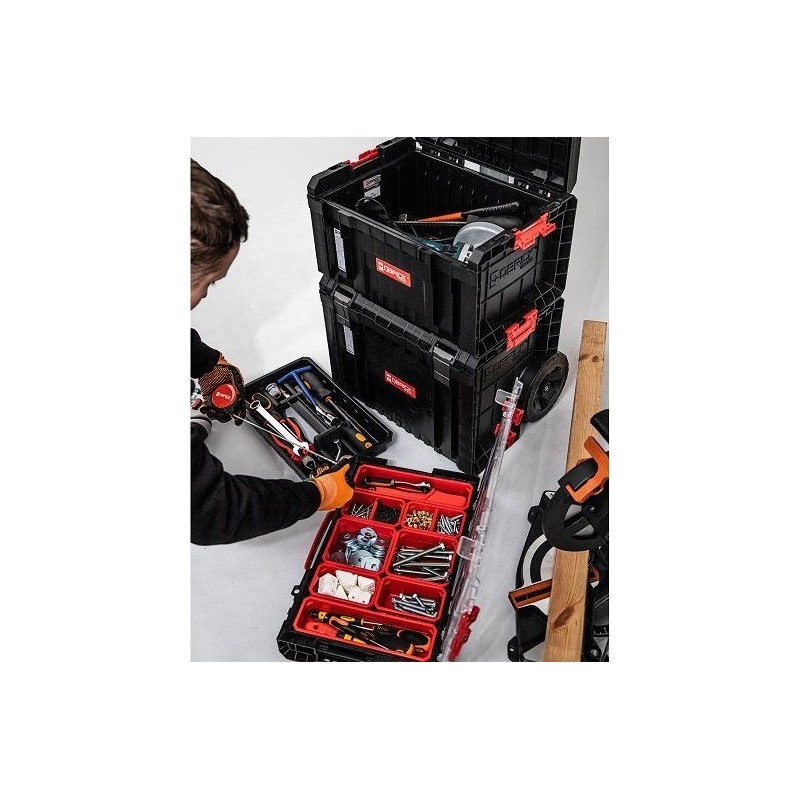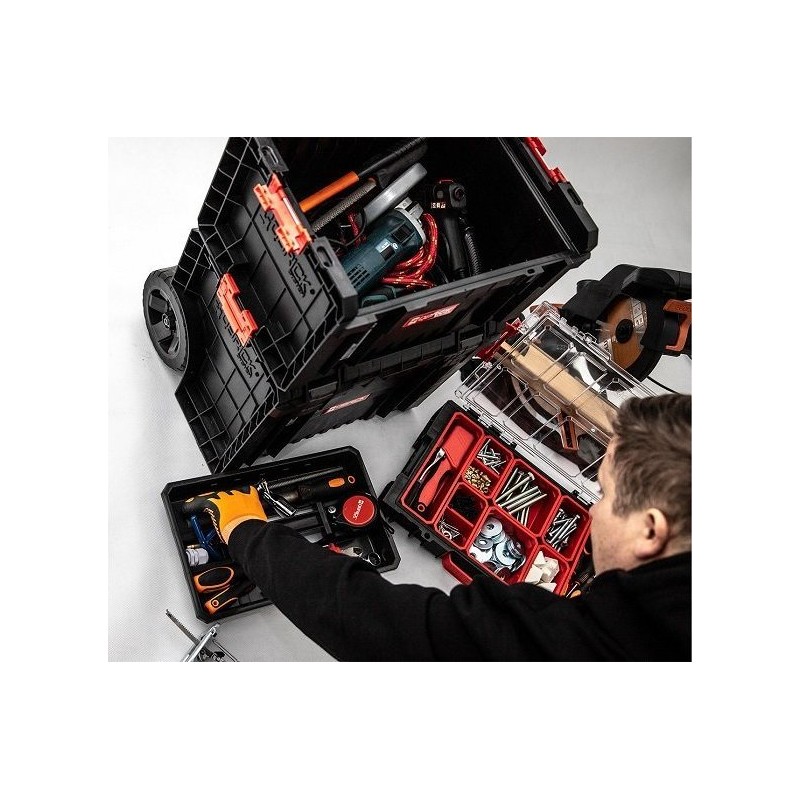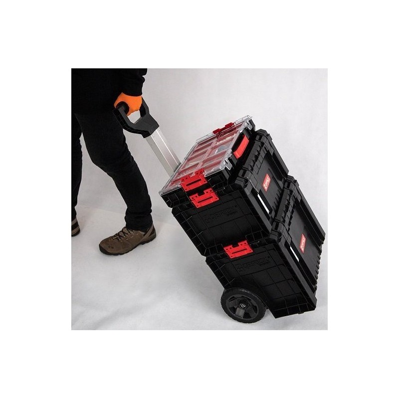 Das Qbrick System PRO ist eine neue Generation kompakter Werkzeugkisten mit einem innovativen Ansatz für Arbeitsergonomie. Die in dieser Klasse einzigartige Funktion, die Boxen mithilfe von Polyamid-Verbindungsstücken miteinander zu verbinden, ermöglicht eine sichere Handhabung. Dieses universelle mobile Set eignet sich sowohl zum Tragen als auch zum Transportieren verschiedener Werkzeuge. Der mobile Werkstattwagen kann dank zweier großer Räder und eines Teleskopgriffs überall dort eingesetzt werden, wo er gebraucht wird.