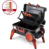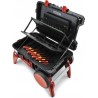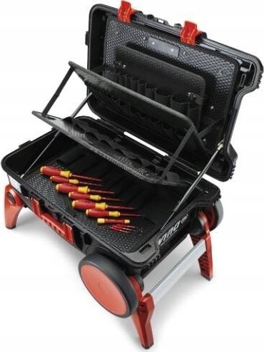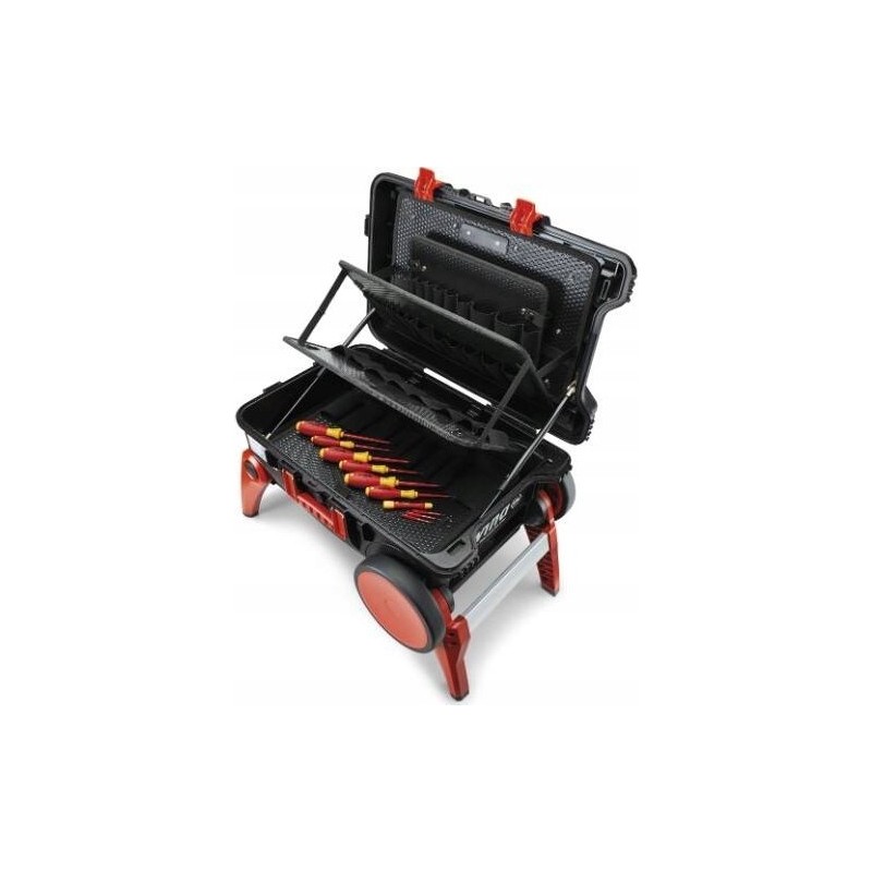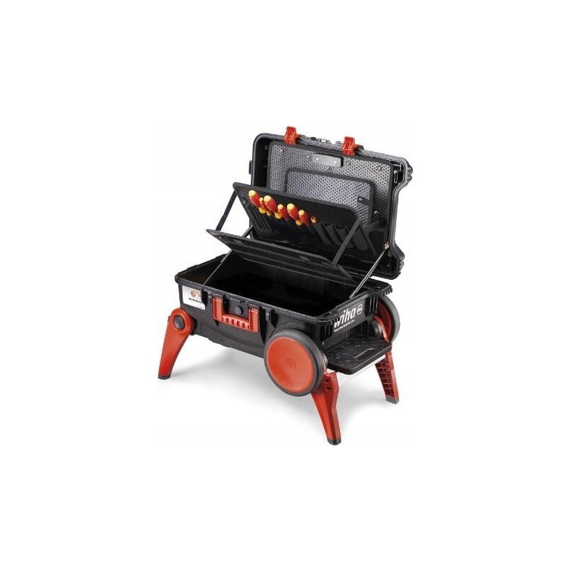 Dank der besonders großen Rollen lässt sich der Koffer problemlos über unebenes Gelände oder Treppen fahren. Ausklappbare Stützfüße ermöglichen den Einsatz des Koffers als rutschfeste Trittstufe. Zudem ermöglicht die erhöhte Position ein bequemes Entnehmen der Werkzeuge und schont so den Rücken. Eine V-förmige Aussparung mit Skala im Kofferdeckel erleichtert das Zuschneiden von z. B. Kabelkanälen direkt am Montageort.