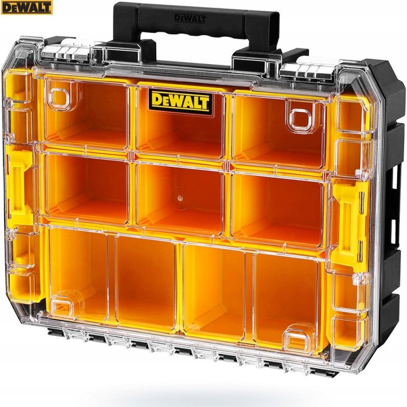 Die DeWalt-Box mit transparentem Deckel und Organizer (2 große und 5 kleine) dient zur Aufbewahrung von Zubehör und anderen Kleinteilen. Durch die spezielle Konstruktion ist ein selbstständiges Verrutschen der Organizer ausgeschlossen. Der amerikanische Hersteller hat auf die Funktionalität seines Produkts geachtet und daher spezielle Halterungen angebracht, die eine modulare Verbindung von TSTAK-Kisten untereinander ermöglichen.