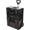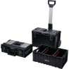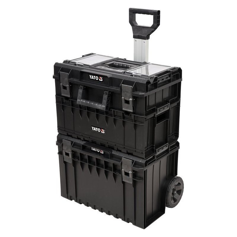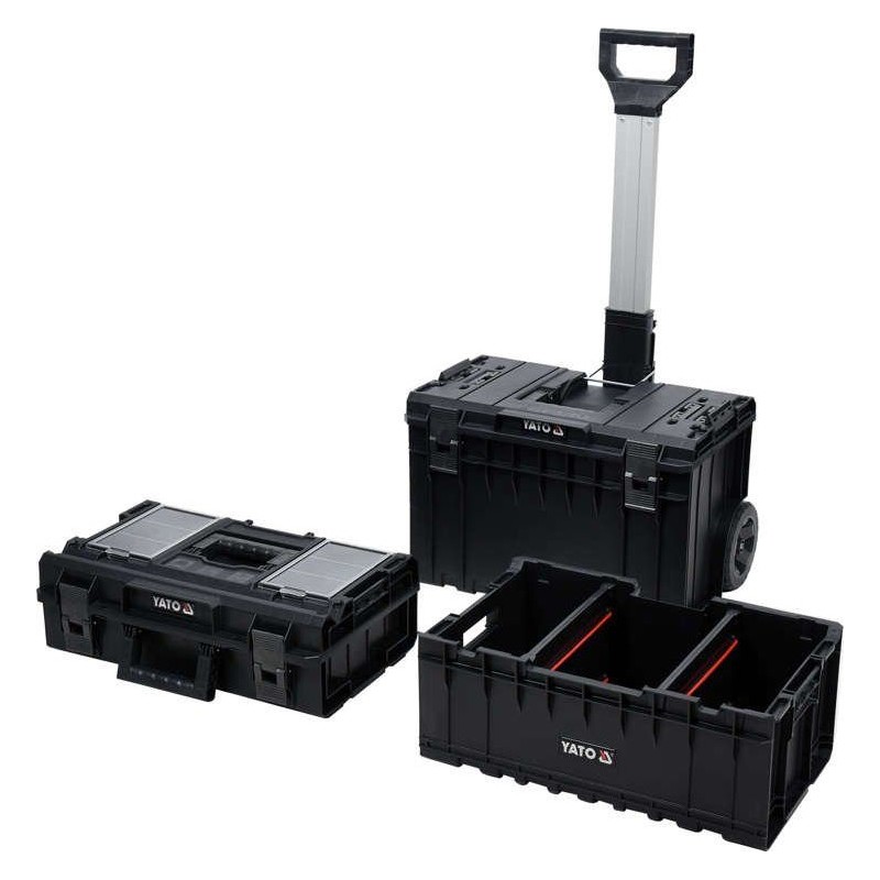 Das modulare, mobile Kistenset YT-09161 ermöglicht die bequeme Aufbewahrung von Werkzeugen und deren einfachen Transport. Das Set besteht aus 3 Elementen, die auch einzeln erhältlich sind: die Basis-Kiste auf Rädern YT-09166, der Behälter YT-09168 und die Kiste YT-09169.