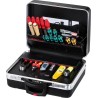 Ausführung: aus robustem, temperatur-, kratz- und bruchfestem X-ABS-Kunststoff, schwarz, mit strapazierfähigen Werkzeugeinlagen aus Con-Pearl®- Material, das gegen Kratzer, Verformungen und Verwindungen sowie gegen Feuchtigkeit, Fette und Chemikalien beständig ist, stabil, pulverbeschichtet, 4-stufiger, ausziehbarer Griff sowie besonders breite, gummierte Rollen. Bodenhöhe 88 mm mit beliebiger Innenraumaufteilung. Mit verzinkten und arretierbaren Metallscharnieren, Belastbarkeit des Koffers bis 40 kg, innerer Doppelrahmen aus Aluminium. Sehr stabil, mit integrierten, den Boden schützenden Gleitern. Verschließbar mit 2 Druckknopfschlössern. Modell für den Lufttransport zugelassen. Lieferung ohne Inhalt.