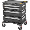 Das Turmsystem besteht aus fünf Modulen, die an unterschiedliche Anforderungen angepasst werden können. Im Set enthalten sind zwei Organizer mit je einer tiefen Schublade sowie ein Organizer mit zwei flachen Schubladen, wodurch Werkzeuge unterschiedlicher Größe untergebracht werden können. Die Arbeitsplatte bietet Platz zum Arbeiten, und die Transportplattform auf Rollen erleichtert das Bewegen des gesamten Sets.