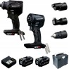 Das Panasonic-Elektrowerkzeug-Set enthält den Bohrschrauber EY1DD2 und den Schlagschrauber EY1PD1, die über robuste und langlebige bürstenlose Motoren verfügen. Das Set umfasst außerdem zwei 18-V/5,0-Ah-Akkus, ein Schnellladegerät und drei austauschbare Arbeitsaufsätze (Winkel-, Exzenter- und Schnellspannbohrfutter), was es zur idealen Lösung für verschiedene Montage- und Bauaufgaben macht. Das Ganze ist in einem robusten Verpackungssystem verpackt, was den Transport und die Lagerung erleichtert.