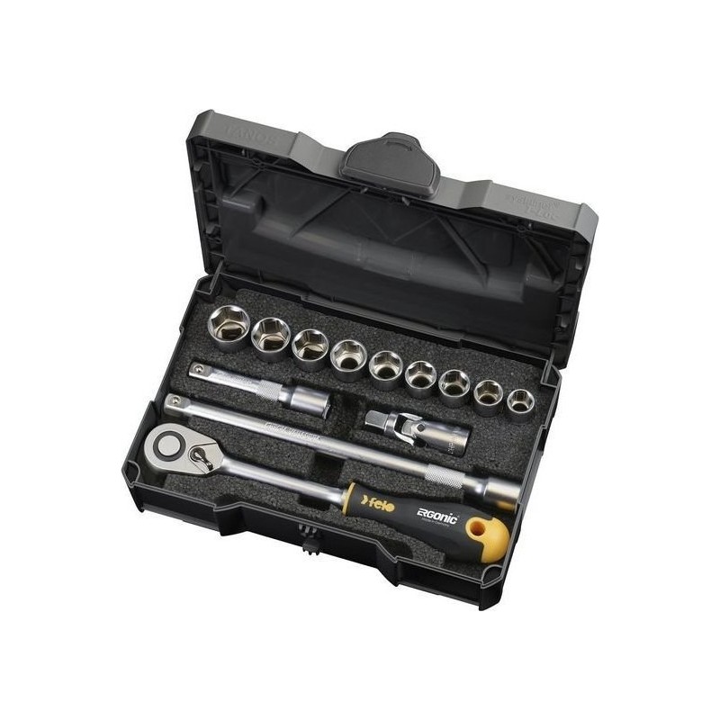 Das Felo ½”-Set enthält 9 Steckschlüsseleinsätze, 2 Verlängerungen, ein Kardangelenk und eine ERGONIC-Ratsche.