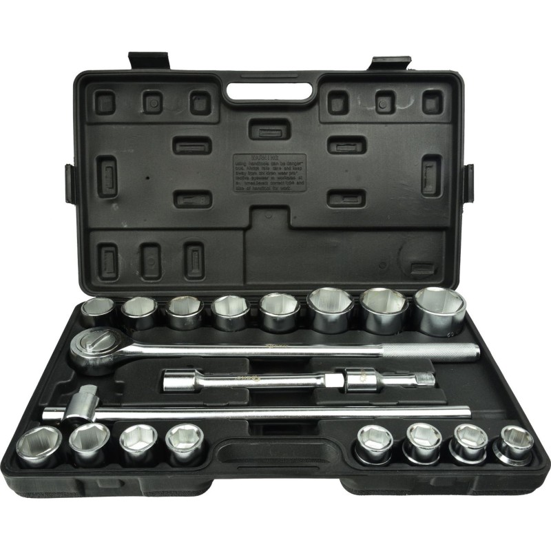 Satz von Steckschlüsseln der Marke GEKO, bestehend aus 21 Teilen. Der Satz enthält einen Satz Sechskant-Steckschlüsseleinsätze mit 3/4"-Aufnahme, einen T-Griff (3/4"), eine Ratsche (3/4") sowie einen Satz Verlängerungen (3/4"). Alle Teile des Sets sind aus hochwertigem CrV-Chrom-Vanadium-Stahl gefertigt. Das Ganze befindet sich in einem praktischen Koffer aus strapazierfähigem Kunststoff.
