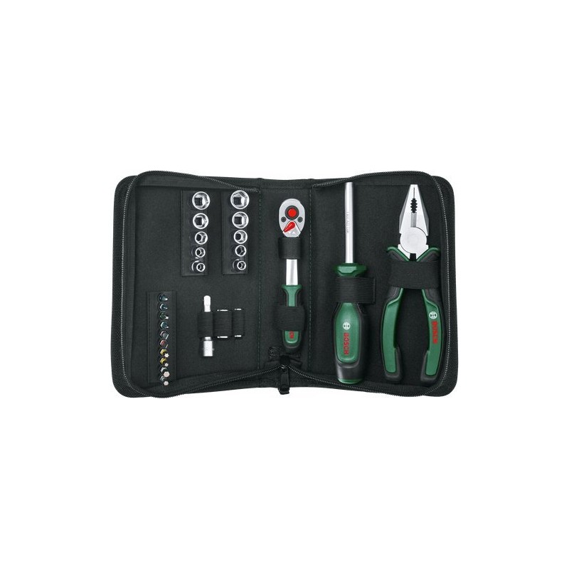 Das vielseitige 26-teilige Handwerkzeugset von Bosch ist die ideale Wahl für Heimwerker, zu Hause und unterwegs. Das kompakte Set enthält eine ¼"-Ratsche, einen Universal-Schraubendreher, eine Zange, 2 Adapter für Schraubbits, 10 Steckschlüsseleinsätze und eine 50-mm-Verlängerung, alles verpackt in einer praktischen Stofftasche mit Reißverschluss. Die leistungsstarke Ratsche liefert ein beeindruckendes Drehmoment von 74–93 Nm, das die Anforderungen der DIN-Norm um 20–50 % übertrifft, und kann dank des 72-Zahn-Getriebes in einem Winkel von 5° eingesetzt werden. Alle Werkzeuge sind aus Materialien höchster Qualität gefertigt und wurden im Hinblick auf hervorragende Ergonomie, lange Lebensdauer und maximalen Komfort entwickelt.