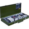 Alle Teile des Sets sind in einem Metallkoffer untergebracht. Der khakifarbene Koffer verfügt über spezielle Fächer. Diese sind auf jedes Werkzeug zugeschnitten. Dank dieser Lösung lassen sich die Werkzeuge leicht finden und nach getaner Arbeit wieder an ihren Platz zurücklegen. Diese Lösung hilft, Unordnung unter den ähnlich aussehenden Teilen des Sets zu vermeiden. Sie bedeutet auch eine Zeitersparnis. Alle Zubehörteile befinden sich immer am richtigen Platz, sodass Sie Ordnung haben und sie im Handumdrehen finden können.