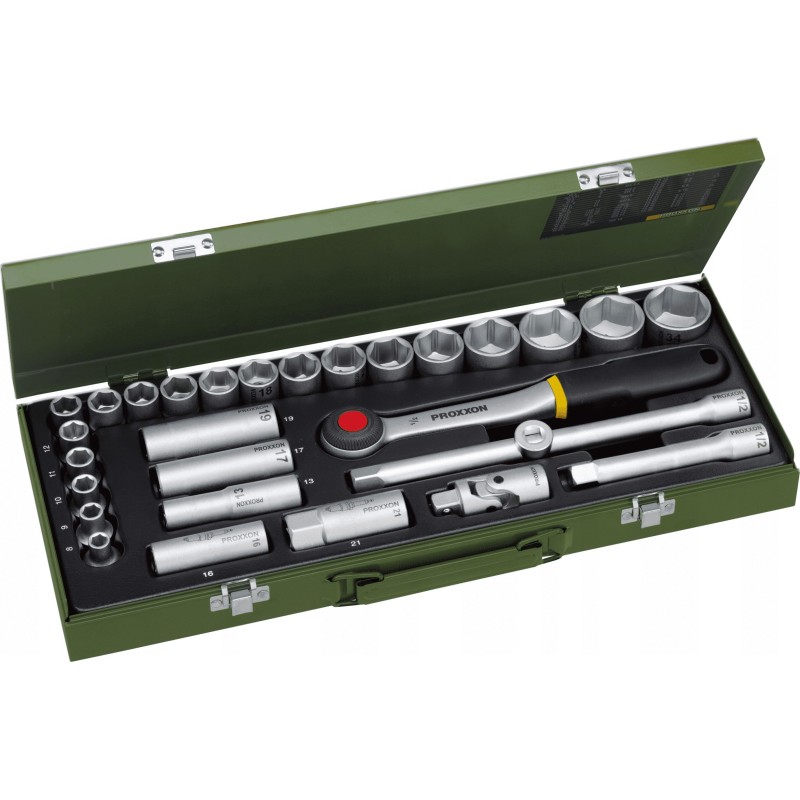 Das PROXXON Steckschlüsselset ½ enthält 29 Teile. Darunter befinden sich zwei Arten von Steckschlüsseleinsätzen: Standard- und Zündkerzen-Einsätze. Darüber hinaus bietet das Set auch Steckschlüsselgriffe, Gelenke, Verlängerungen und eine Ratsche. Die Größe der Teile ist auf den gängigen 1/2"-Standard abgestimmt. Die Teile wurden so ausgewählt, dass sie alle Erwartungen und Bedürfnisse des Anwenders erfüllen. Dank der Ausstattung mit universellen Teilen eignet sich das Set für viele Anwendungsbereiche. Die große Auswahl an Teilen wird jeder Anwender zu schätzen wissen.