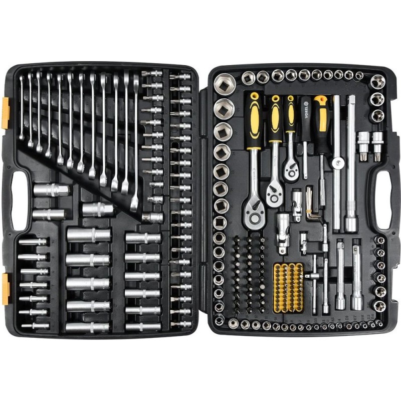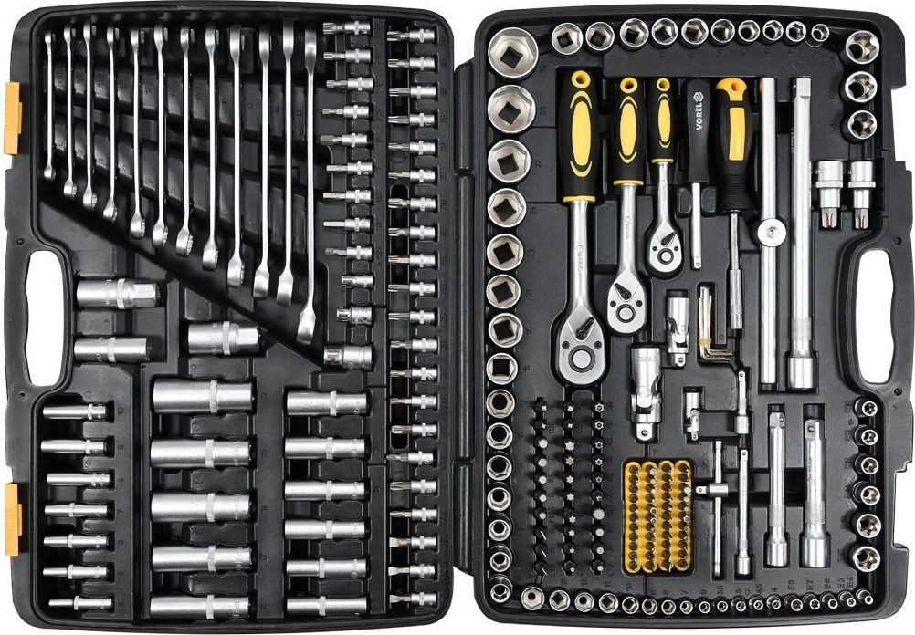 Der VOREL-Werkzeugsatz besteht aus 216 Teilen, die in einem praktischen Kunststoffkoffer untergebracht sind. Die Werkzeuge wurden präzise aus Materialien gefertigt, die ihre Zuverlässigkeit gewährleisten. Der Satz enthält ein komplettes Sortiment an langen und kurzen Steckschlüsseleinsätzen in den Größen 1/4", 3/8" und 1/2", Verlängerungen, Kardangelenke und viele weitere Teile, darunter Ratschen mit 45 Zähnen. Dank dieser Zusammensetzung eignet sich das Set für kleinere Montagearbeiten, mechanische Reparaturen und viele andere Arbeiten im Haushalt oder in der Werkstatt.