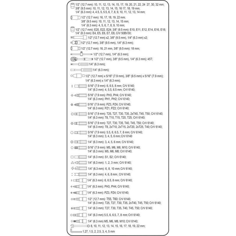 • 1/2": 10; 11; 12; 13; 14; 15; 16; 17; 19; 20; 21; 22; 24; 27; 30; 32 mm