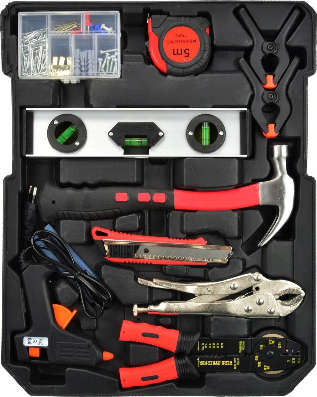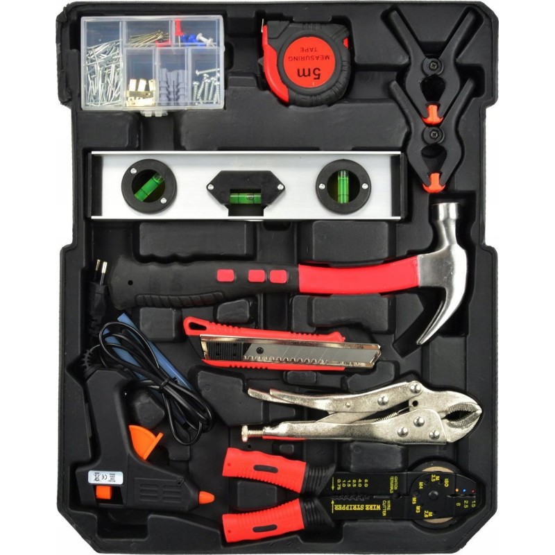 Das Set enthält nicht nur grundlegende Werkzeuge, sondern auch nützliches Zubehör wie einen Spannungsprüfer, eine Aluminium-Wasserwaage und eine Heißklebepistole. Damit ist das Geko-Set eine Komplettlösung, die den Bedürfnissen jedes Anwenders gerecht wird.