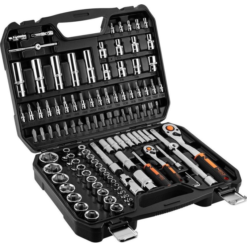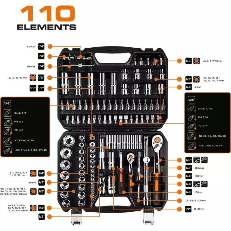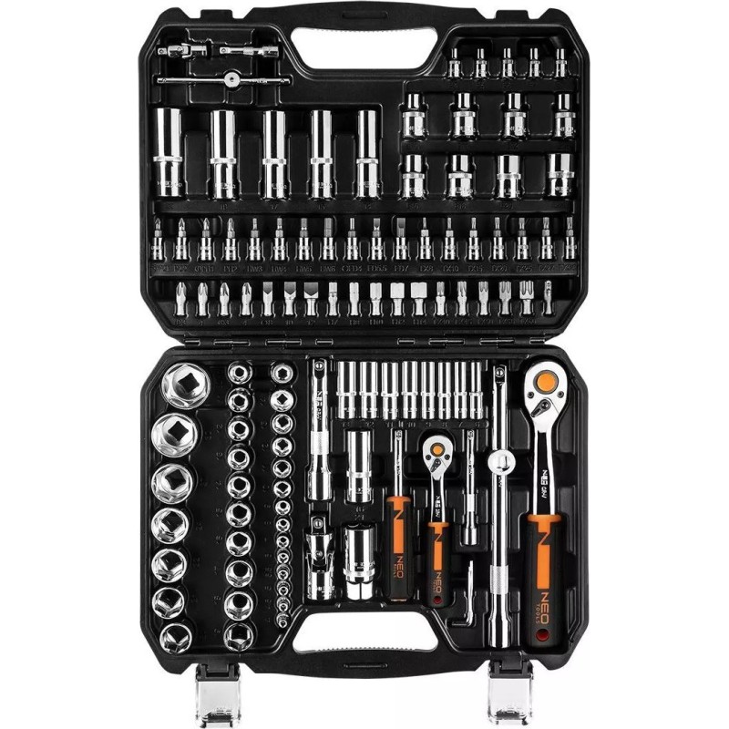 Hochwertiges, vielseitiges Steckschlüsselset in den Größen ½” und ¼” mit insgesamt 110 Werkzeugen und Zubehör der Marke NEO. Die Produkte werden in einem praktischen Kunststoffkoffer mit Metallverschlüssen und einem handlichen Griff angeboten. Zudem ist das Innere der Verpackung mit einer speziellen Einlage ausgekleidet, die für Ordnung sorgt und den Inhalt vor Beschädigungen schützt.