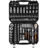 Das Set besteht aus: ½-Zoll- und ¼-Zoll-Ratschen (verbesserte Versionen mit präzisem Ratschenmechanismus mit 90 Zähnen, mit gebogenen und ergonomischen Griffen), 17 Stück ½-Zoll-Sechskantsteckschlüsseleinsätzen in den Größen von 10 bis 32 mm, 5 Stück lange Sechskant-Steckschlüsseleinsätze ½” in den Größen 14 bis 22 mm, 13 Stück Sechskant-Steckschlüsseleinsätze ¼” in den Größen 4 bis 14 mm, 8 Stück Sechskant-Steckschlüsseleinsätze ¼” in den Größen 6 bis 13 mm, 8 Stück ½-Zoll-TORX-Steckschlüsseleinsätze in den Größen E10 bis E24, 5 Stück ¼-Zoll-TORX-Steckschlüsseleinsätze in den Größen E4 bis E8, 18 Stück ¼-Zoll-Steckschlüsseleinsätze in den Größen T8 bis T27, H3 bis H6, PH1, PH2, PZ1, PZ2, SL4, SL5 und SL7, 17 Stück 5,16-Zoll-Bits (flach, Kreuzschlitz, Sechskant und TORX), 4 Stück Sechskantschlüssel in den Größen 1,3 bis 2,5 mm sowie Zubehör – T-Griff ½”, 2 Verlängerungen ½” – 125 mm und 150 mm, Zündkerzensteckschlüssel ½”, 5,6”-Bitadapter, ½”-Gelenk, ¼”-Bithalter, T-Griffe ¼”, 2 Verlängerungen ¼” – 50 mm und 100 mm, ¼”-Gelenk.