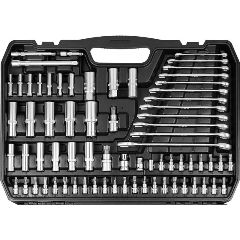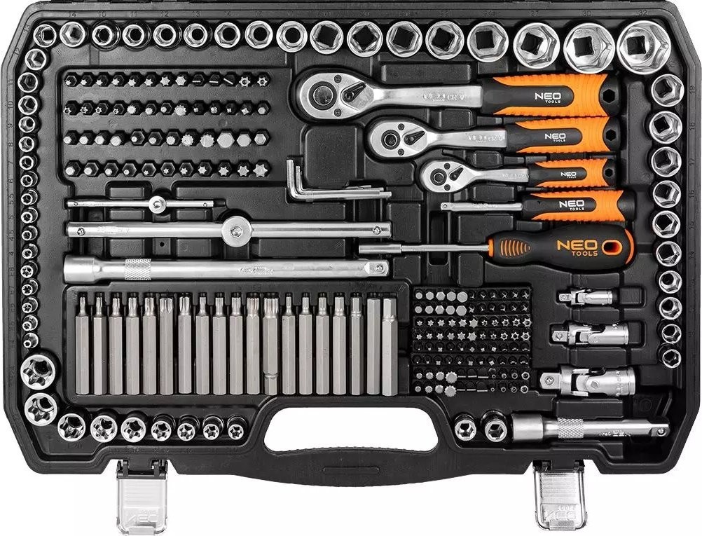 Umfassendes Set mit Schraubenschlüsseln und Zubehör der Marke NEO, bestehend aus 300 Teilen mit den Befestigungsdurchmessern ½”, 3/8” und 1/4”. Ein Werkzeugangebot mit 25 Jahren Garantie für die anspruchsvollsten Anwender, das die höchste Qualität der angebotenen Produkte bestätigt. Enthält die unverzichtbare Ausrüstung für jeden Heimwerker, u. a. Ring-Maulschlüssel, Sechskantschlüssel, Steckschlüsseleinsätze, Ratschen, Drehknöpfe, Verlängerungen, Halterungen und vieles mehr.
