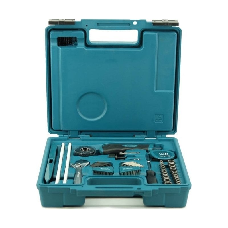 Das Makita-Werkzeugset E-11689 eignet sich für die Ausführung vieler verschiedener Aufgaben. Das 256-teilige Set aus Zubehör und Werkzeugen ist in einem zweistöckigen Koffer der Marke Makita untergebracht, der den Transport- und Aufbewahrungskomfort erhöht. Im Set enthalten sind 45 Metallbohrer, 8 Spiralbohrer für Holz, Schraubaufsätze, eine Senkbohrerspitze und viele weitere Zubehörteile. Zusätzlich befinden sich im Koffer Werkzeuge wie eine Wasserwaage, ein Maßband, ein Verstellschlüssel, Inbusschlüssel und andere Werkzeuge.