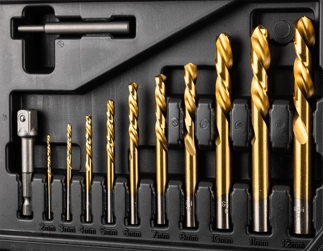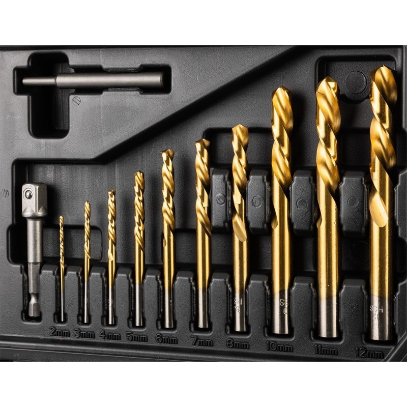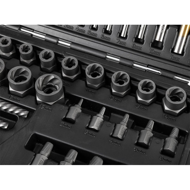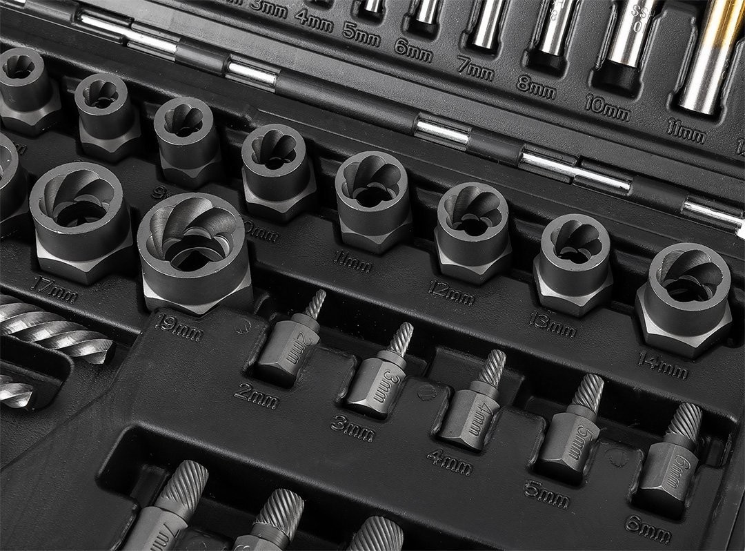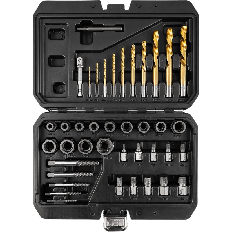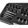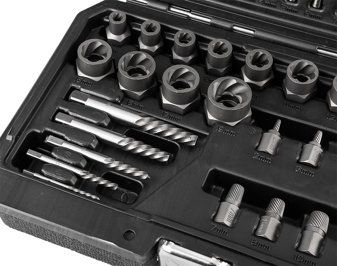 Set für beschädigte Schrauben, 40-teilig, Metallbohrer (10 Stück): 2, 3, 4, 5, 6, 7, 8, 10, 11, 12 mm; lange Schraubendreher (5 Stück); ; Schraubendreher (Einsätze) für beschädigte Muttern 3/8 (13 Stück): 6, 7, 8, 9, 10, 11, 12, 13, 14, 15, 16, 17, 19 mm; Schraubendreher (10 Stück): 2, 3, 4, 5, 6, 7, 8, 10, 11, 12 mm; Adapter für Steckschlüsseleinsätze: Sechskant -> 3/8-Zoll-Vierkant (1 Stk.); Ausdreher (1 Stk.); Material: CRV, CrMo, S2.