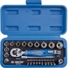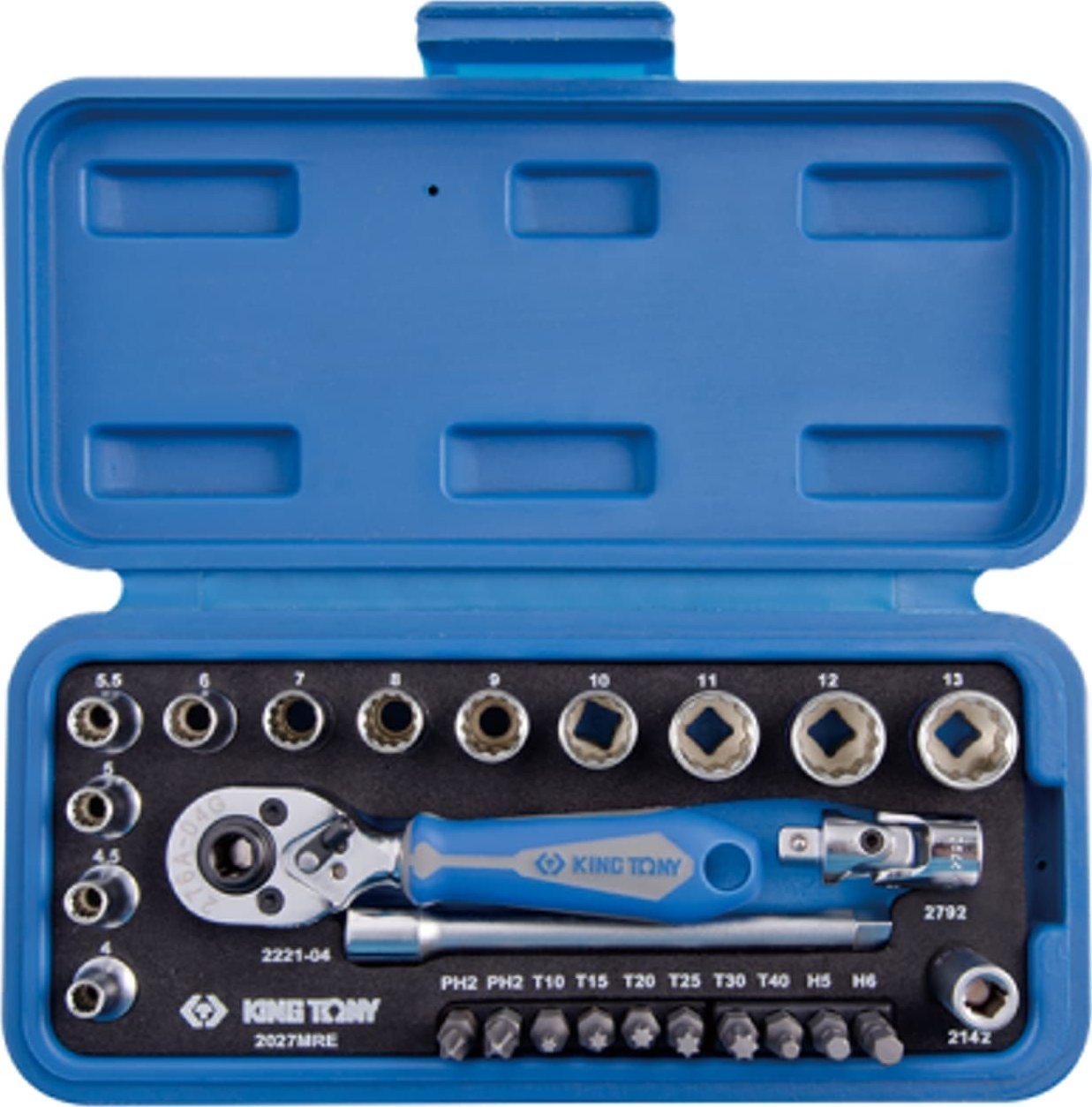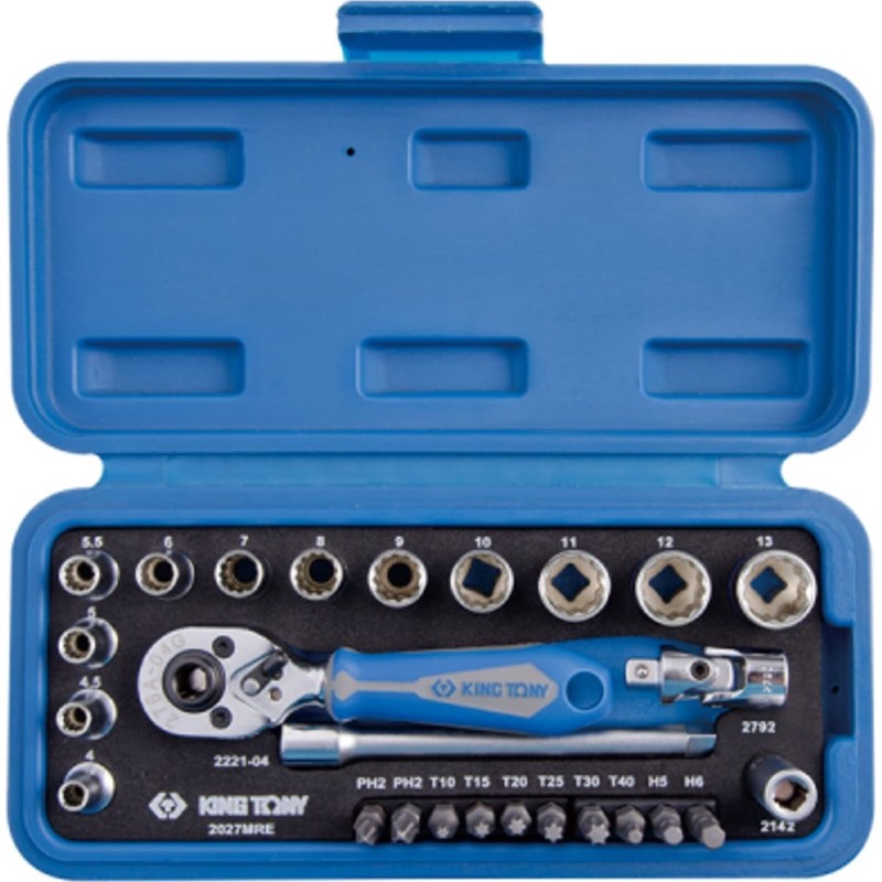 King Tony Werkzeugset 1/4" 27-teilig. Kurze Steckschlüsseleinsätze, 12-kant, 4–14 mm, mit Ratsche und Zubehör, King T-Kassette