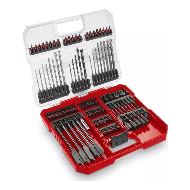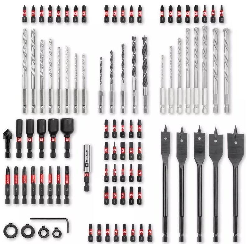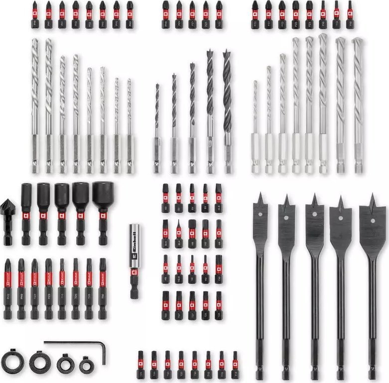 Einhell 49108798. Verwendungszweck: Bohrmaschine, Bohrertyp: Bohrerset, Produktlänge: 50 mm. Verpackungstiefe: 42 mm, Verpackungsbreite: 275 mm, Verpackungshöhe: 235 mm. Verpackungsart: Karton. Anzahl der Bohrer: 95 Stück.