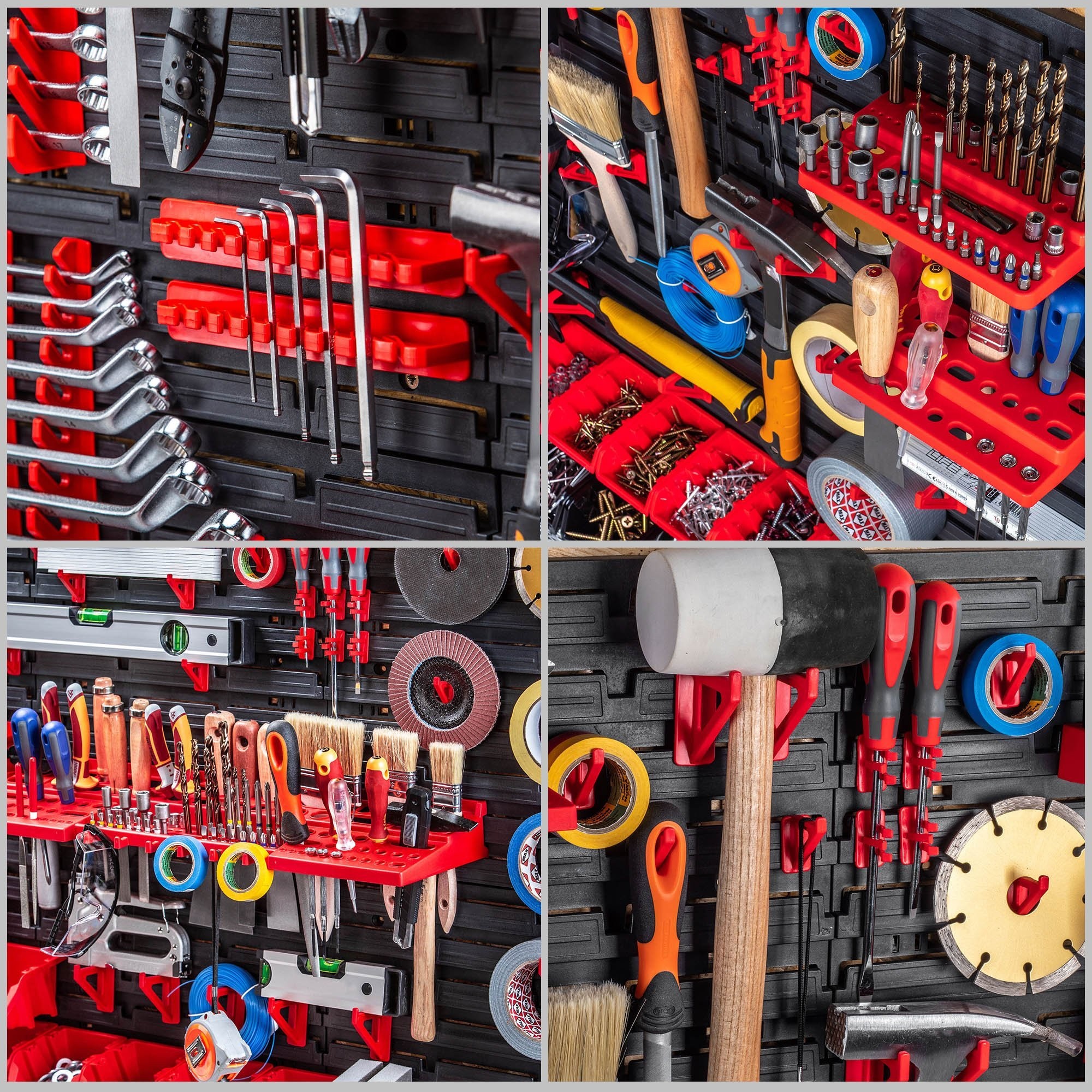 MODULARER AUFBAU – die große Werkzeugwand ist modular aufgebaut. Sie besteht aus vielen Elementen, die frei konfiguriert und um zusätzliche Module erweitert werden können. Die universelle Leiste ermöglicht das Aufhängen von Werkstattwannen, Regalen und Werkzeughaltern.