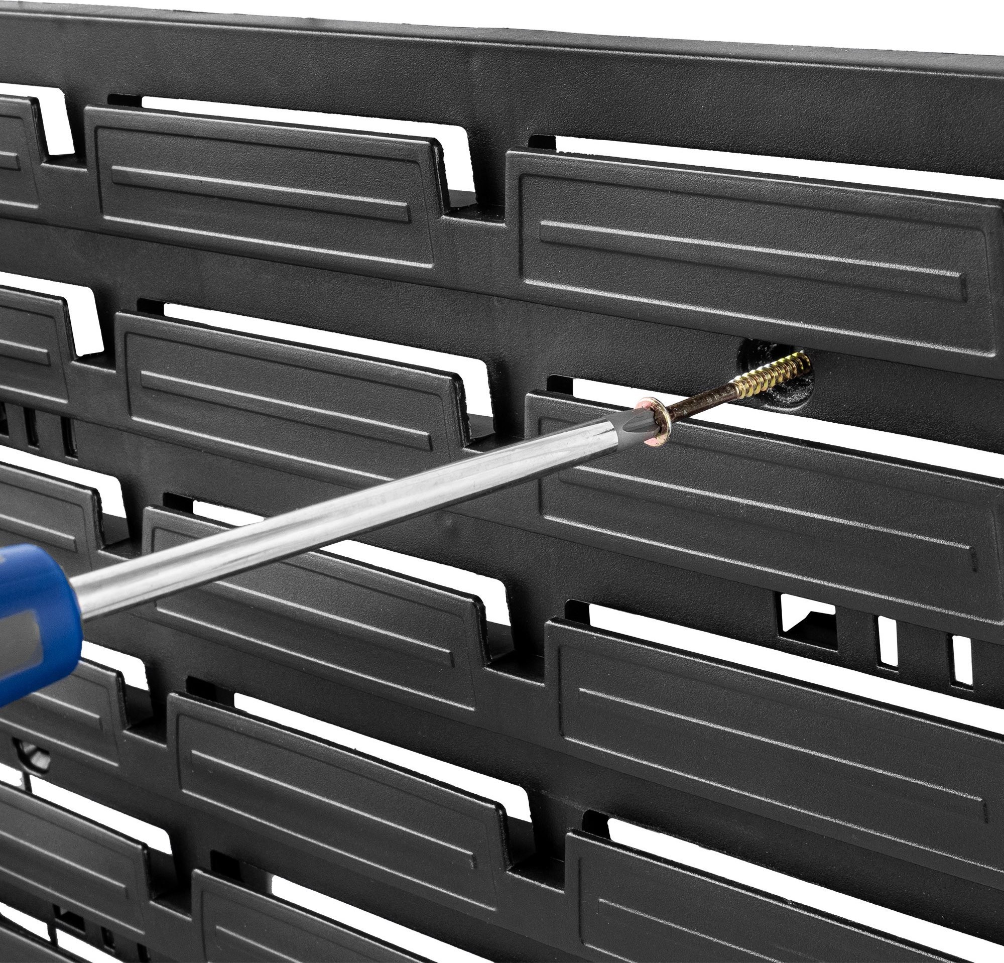 MODULARER AUFBAU – Die große Werkzeugtafel ist modular aufgebaut. Sie besteht aus vielen Elementen, die du frei konfigurieren und um weitere Module erweitern kannst. Die universelle Leiste ermöglicht das Aufhängen von Werkstattbehältern, Regalen sowie Werkzeughaltern.