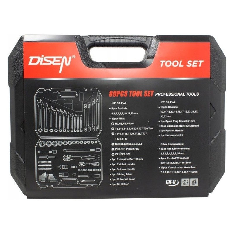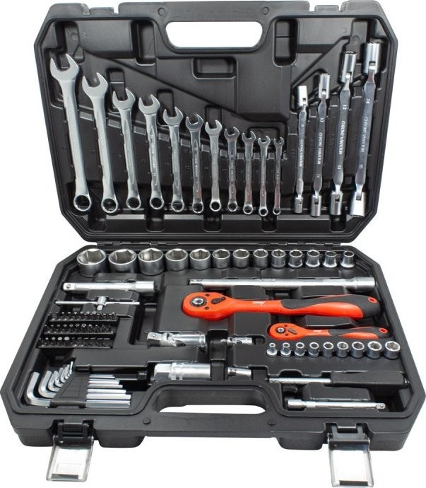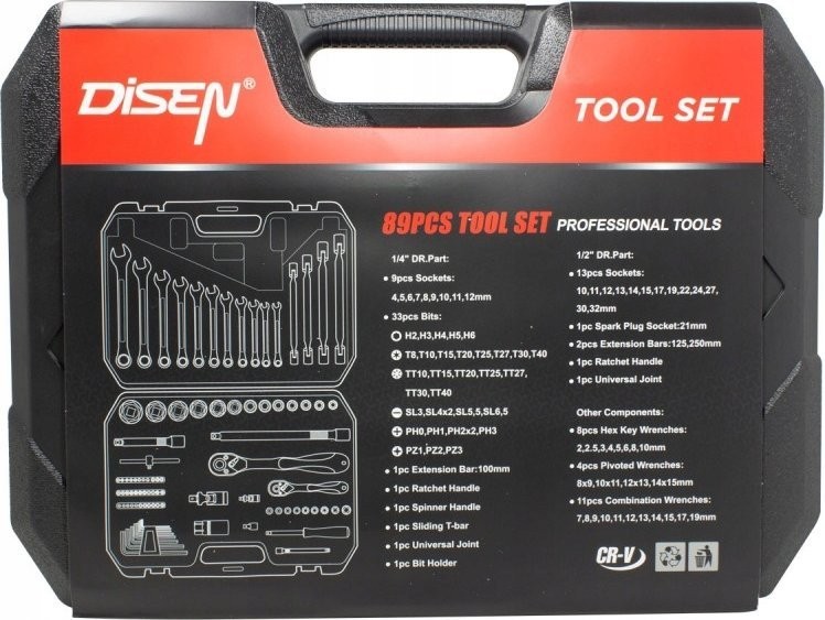 Das Set enthält 89 Werkzeuge, die sich sowohl für Hobbyhandwerker als auch für Profis eignen. Sie sind aus Chrom-Vanadium-Stahl (CRV-50 – Werkzeugstahl) gefertigt. Dadurch können die Werkzeuge bei Arbeiten eingesetzt werden, die hohe Kräfte erfordern.