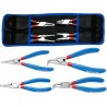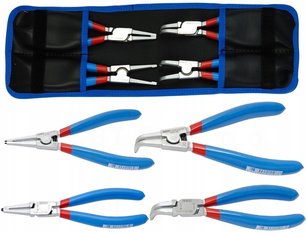 Das Set besteht aus vier Teilen, darunter sowohl Außen- als auch Innenzangen für Seger-Ringe, in gerader und abgewinkelter Ausführung. Diese Auswahl an Werkzeugen macht das Set äußerst funktional und auf die unterschiedlichen Bedürfnisse der Anwender zugeschnitten.