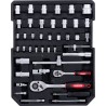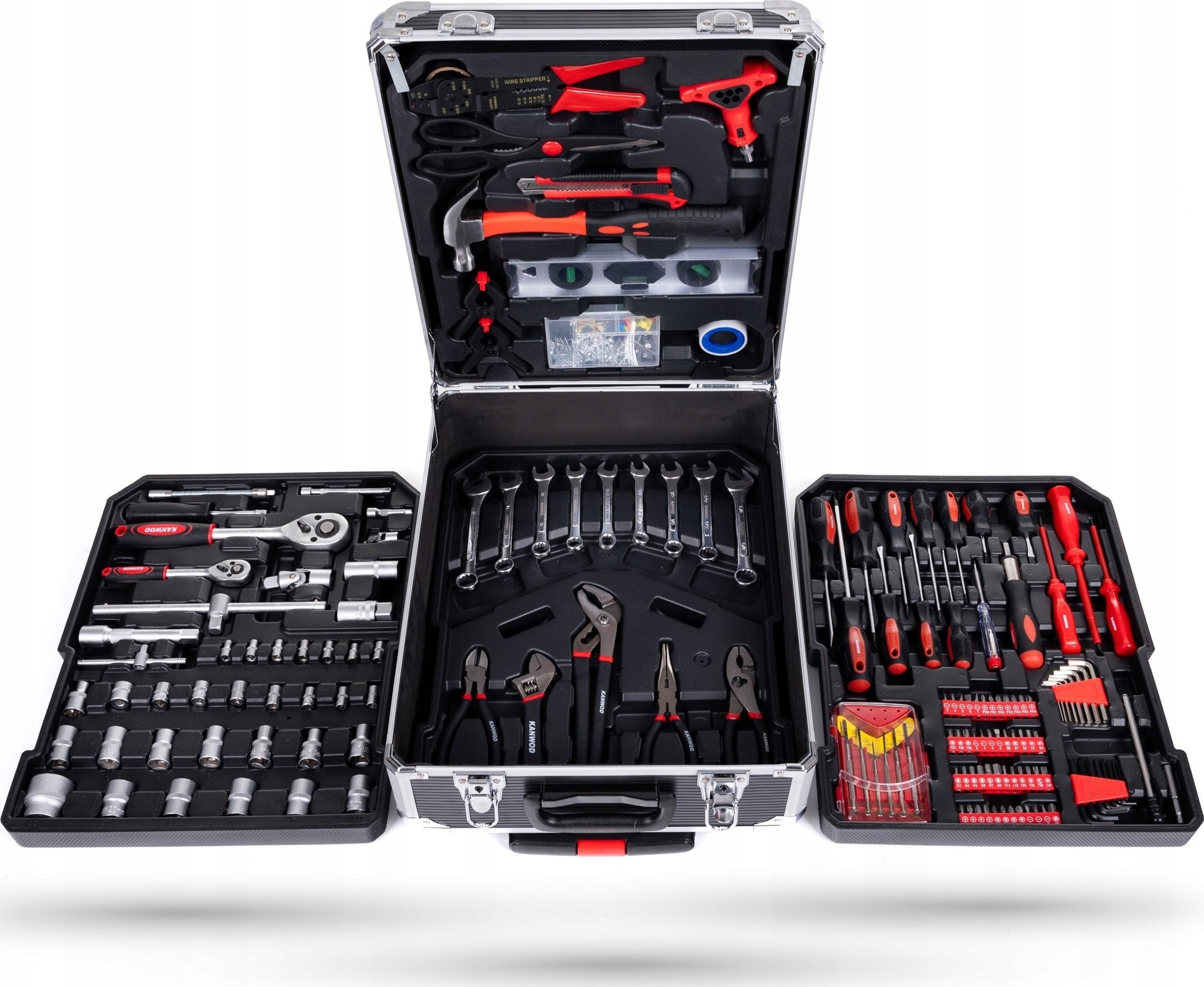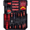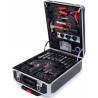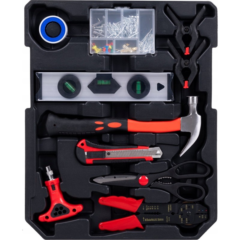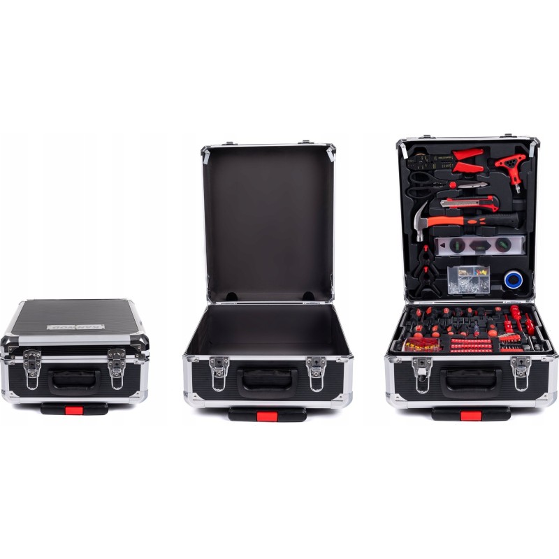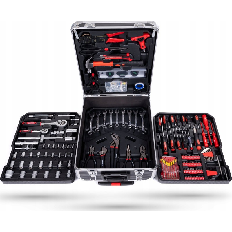 • Im Koffer finden Sie unter anderem Schraubenschlüssel, Zangen, Schraubendreher, Inbusschlüssel, Zangen, einen Hammer, eine Wasserwaage, Steckschlüsseleinsätze und viele weitere Werkzeugzubehörteile.