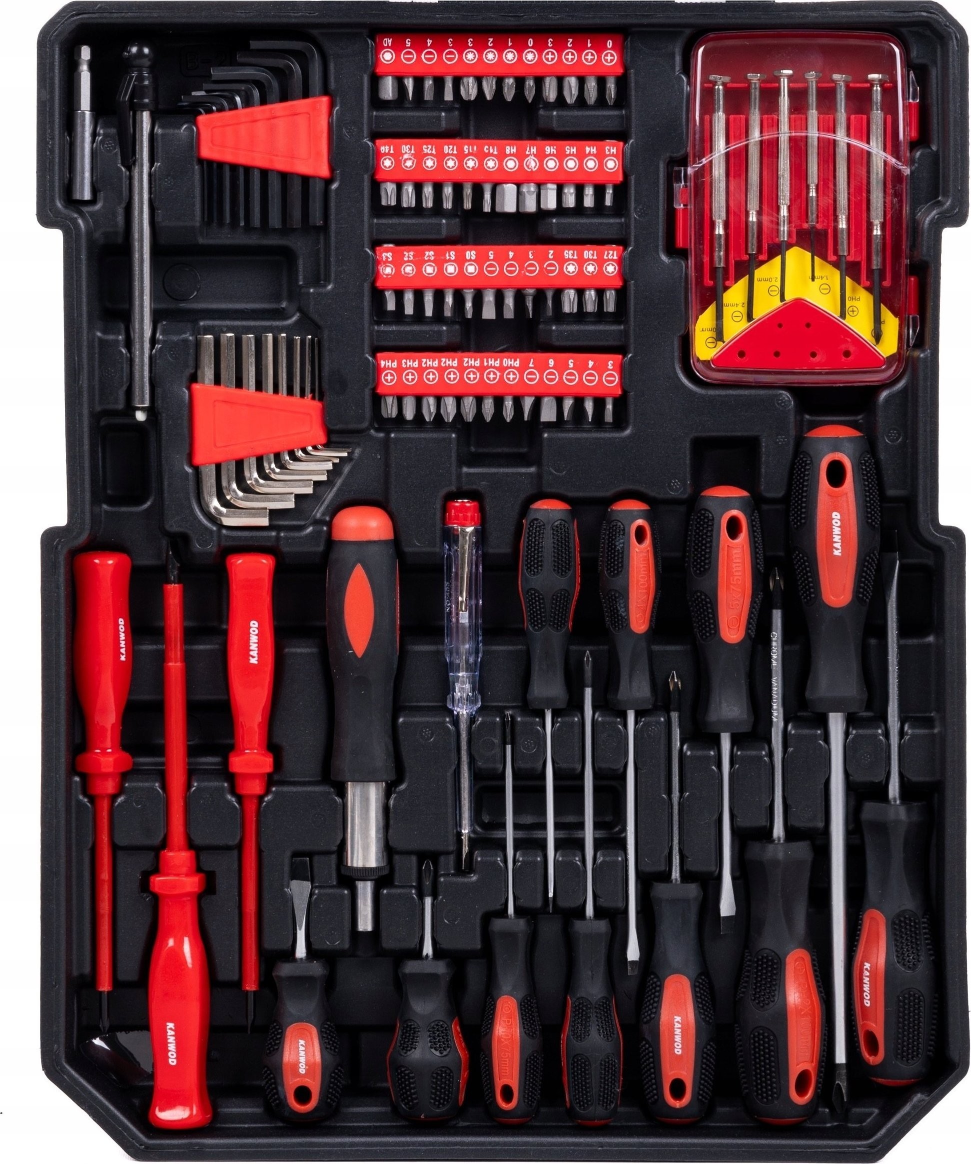 • Vier praktische, herausnehmbare Organizer, die die Werkzeuge nach Typ gruppieren, sorgen für Ordnung und gewährleisten einen einfachen Zugriff auf die einzelnen Teile des Sets.