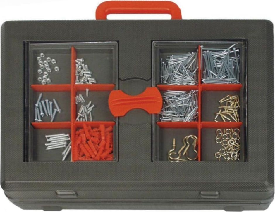 • 475 x verschiedene Befestigungselemente (darunter Nägel, Schrauben, Haken, Blindstopfen und Klammern)