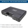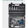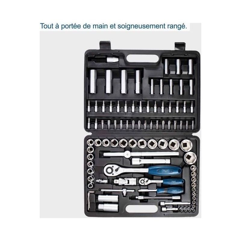 • Das kompakte Werkzeugset enthält 2 Ratschen (½ Zoll und ¼ Zoll), verschiedene Steckschlüssel, Bits und viele weitere Zubehörteile