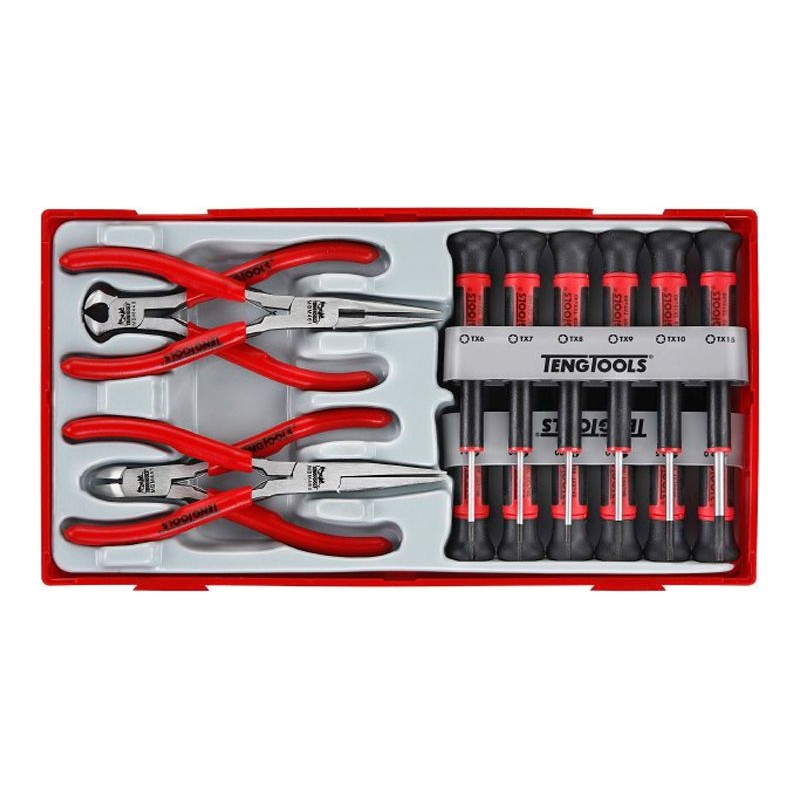 Das Präzisionsschraubendreher- und Zangenset TTMI16 enthält 16 Teile, darunter 12 Präzisionsschraubendreher und 4 Zangen. Das gesamte Set befindet sich in einem Kunststoffbehälter mit abnehmbarem Deckel.