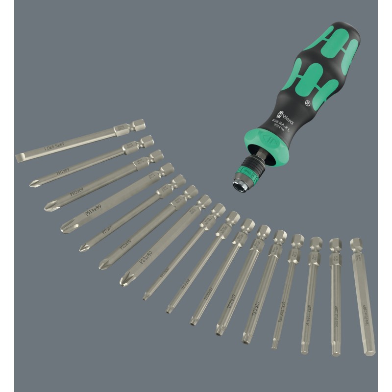 Das Set enthält 16 Bits mit einer Länge von 89 mm, die mit verschiedenen Schraubentypen kompatibel sind, darunter Kreuzschlitz, TORX und Sechskant. Diese Vielfalt macht das Set ideal für ein breites Anwendungsspektrum, sowohl in Heimwerkstätten als auch in professionellen Umgebungen.