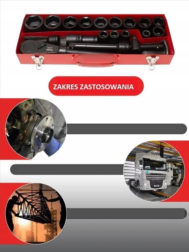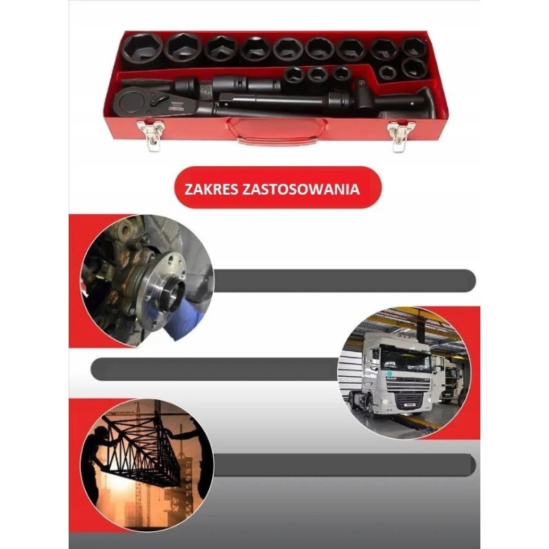 Der Satz ermöglicht Arbeiten, die sehr hohe Belastungen und Präzision erfordern, und ermöglicht die Durchführung vieler Wartungsarbeiten im Zusammenhang mit dem Lösen und Anziehen von Schraubverbindungen verschiedener Nennweiten.