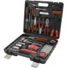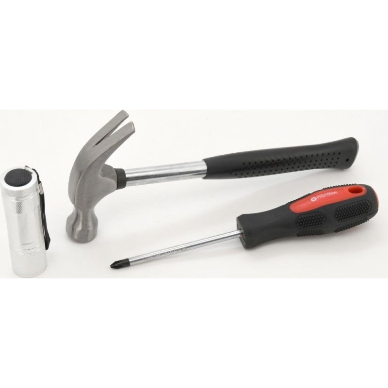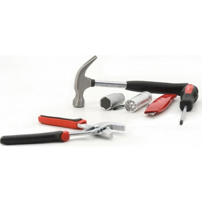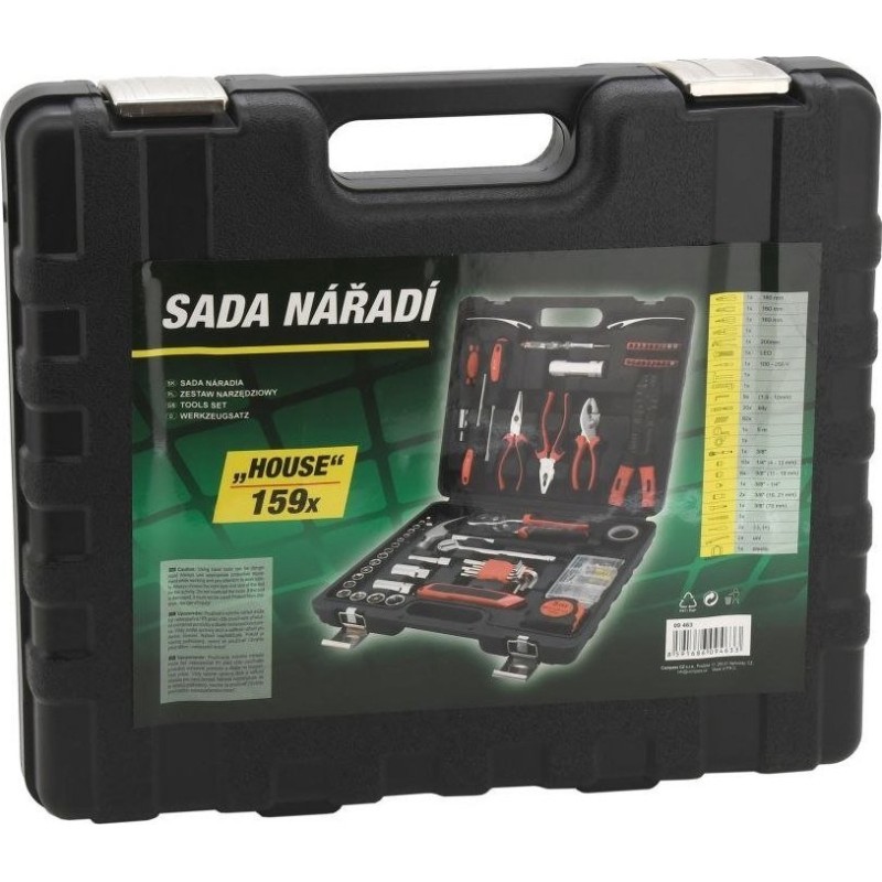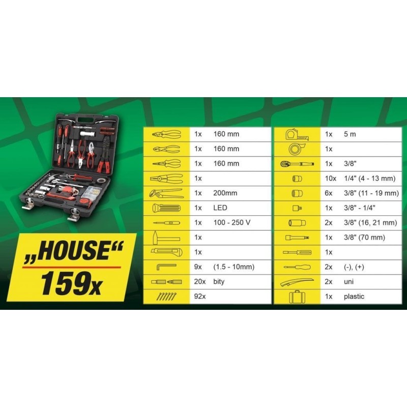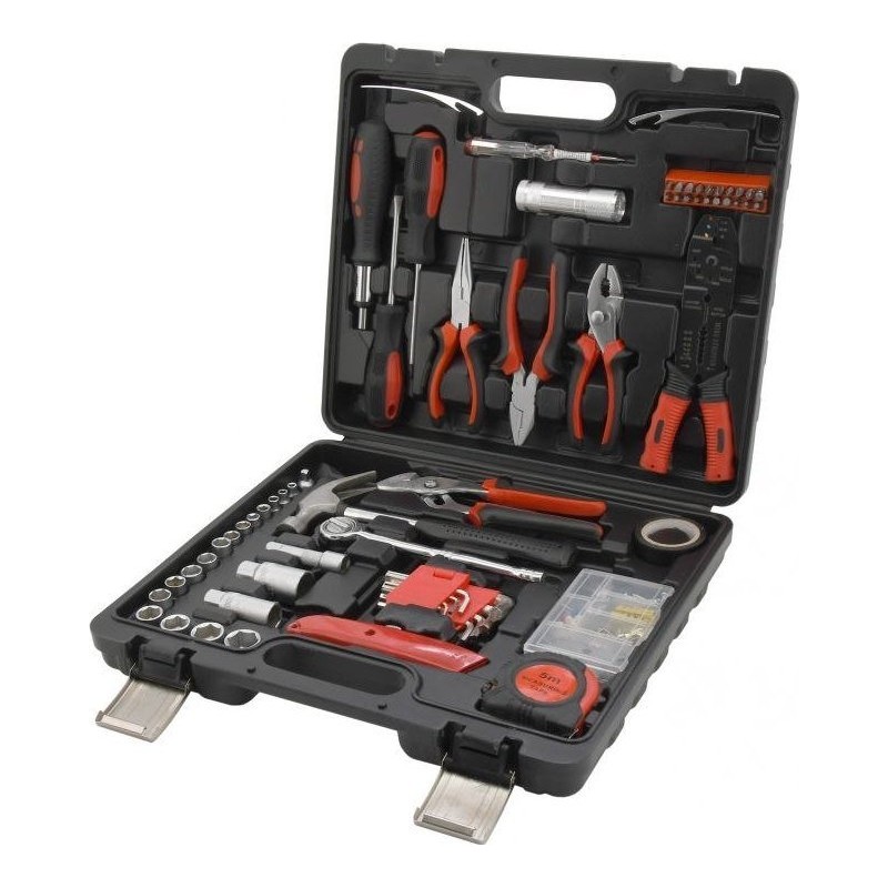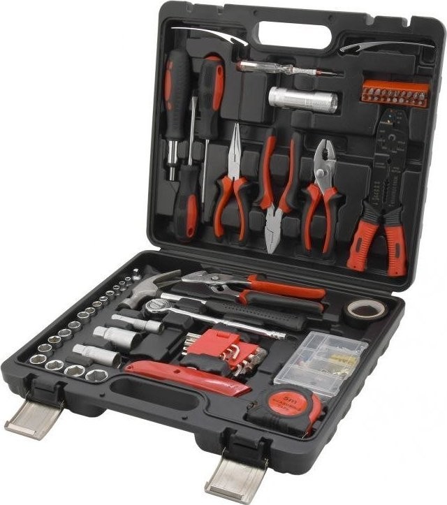 Ein praktischer Koffer mit hochwertigen Werkzeugen und grundlegenden Befestigungselementen. Das Set enthält ergonomische Schraubendreher, Sechskantschlüssel, eine Rasierklinge, die gängigsten Zangenarten, darunter eine Elektrikzange, einen Hammer, eine 3/8"-Ratsche mit Bits, eine LED-Taschenlampe, einen Schraubendreher mit 20 Bits, ein Maßband (5 m), Isolierband und vieles mehr. Das Set wird in einem Koffer geliefert, der sich besonders für den Hausgebrauch, aber auch für die Garage und unterwegs eignet.