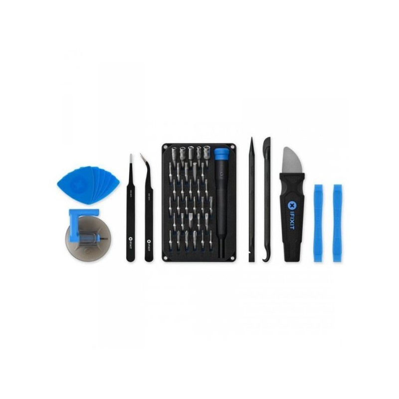 Das Set enthält außerdem nützliches Zubehör wie ESD-Pinzetten, Saugnäpfe und Öffnungswerkzeuge, was die Funktionalität des Sets erhöht. Eine magnetische Arbeitsmatte bietet zusätzliche Unterstützung und ermöglicht die Organisation der Teile während der Reparatur.