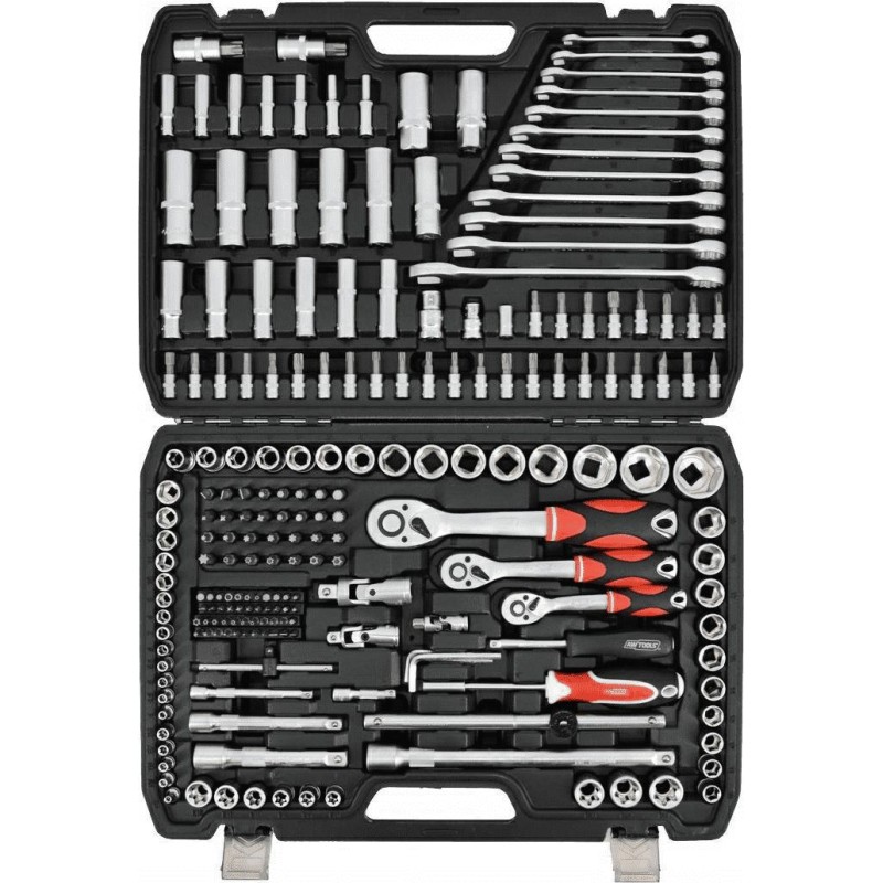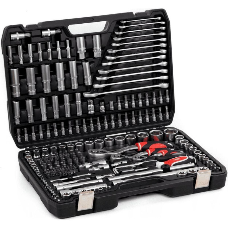 Professioneller Ratschenschlüsselsatz mit 1/4", 3/8" und 1/2" Antrieb. Der doppelseitige Ratschenschlüssel eignet sich ideal zum Anziehen und Lösen von Schrauben an schwer zugänglichen Stellen. Der Schnellspannknopf ermöglicht einen schnellen Wechsel von Steckschlüsseleinsätzen und Bits. Der Ratschenmechanismus ist mit 72 Zähnen ausgestattet – in 5-Stufen-Schritten. Der Hebel an der Rückseite des Kopfes ermöglicht einen schnellen und reibungslosen Richtungswechsel. Der weiche, gummierte Griff sorgt für einen bequemen Halt. Alle Aufsätze sind zur leichteren Identifizierung mit einer Größenangabe versehen. Dank der übersichtlichen Anordnung aller Teile im Werkzeugkoffer ist dieses Set leicht zu transportieren.