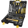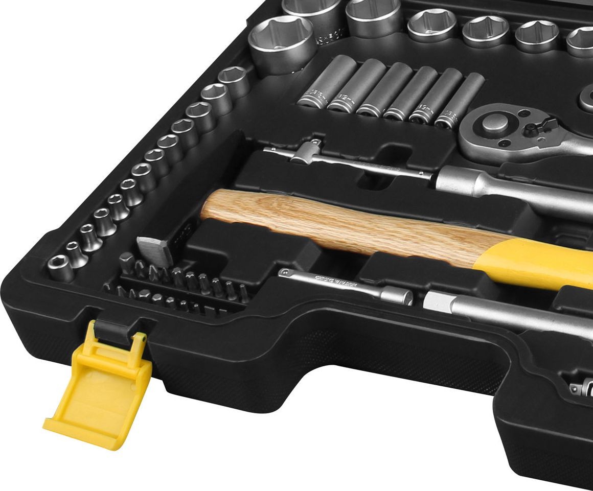 Der Werkzeugsatz besteht aus fünfundachtzig Teilen, darunter Ratschen in den Größen 1/4 und 1/2 Zoll sowie Steckschlüsseleinsätze in den Größen von 7 bis 24 Millimeter in CR-V-Qualität. Ein fester Bestandteil des Sets sind Seitenschneider, verlängerte gerade Zangen sowie verstellbare Zangen. Außerdem enthält es einen Satz Schraubenschlüssel in den Größen von 6 bis 27 Millimetern, einen Satz Schraubendreher, einen Hammer, Meißel, ein 5-Meter-Maßband sowie ein Messer. Die Werkzeuge sind in einer Kunststoffkiste untergebracht, die mit einem ergonomischen Griff ausgestattet ist, der sich nur auf einer Seite der Kiste befindet. So kann man sicher sein, dass man sie immer von der richtigen Seite öffnet und ein Herausfallen der Werkzeuge verhindert wird.