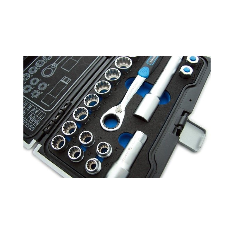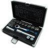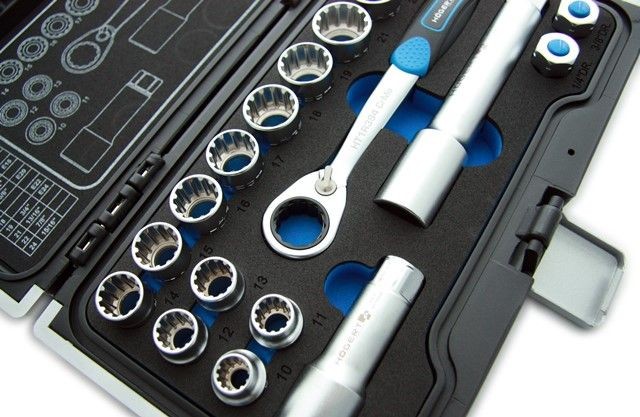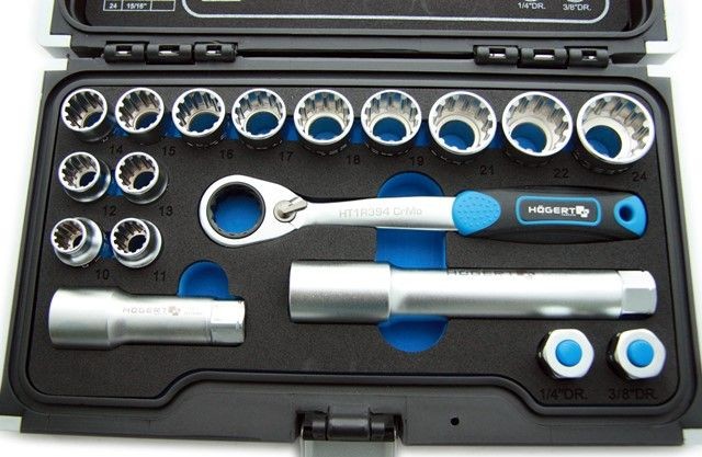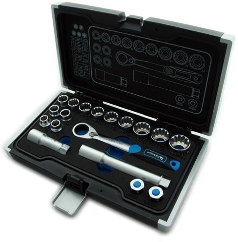 Ratsche, Steckschlüsseleinsätze und Zubehör sind durchgehend und ermöglichen das Arbeiten an langen Bolzen (Stoßdämpfer).