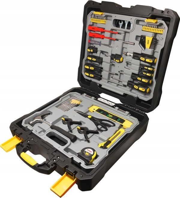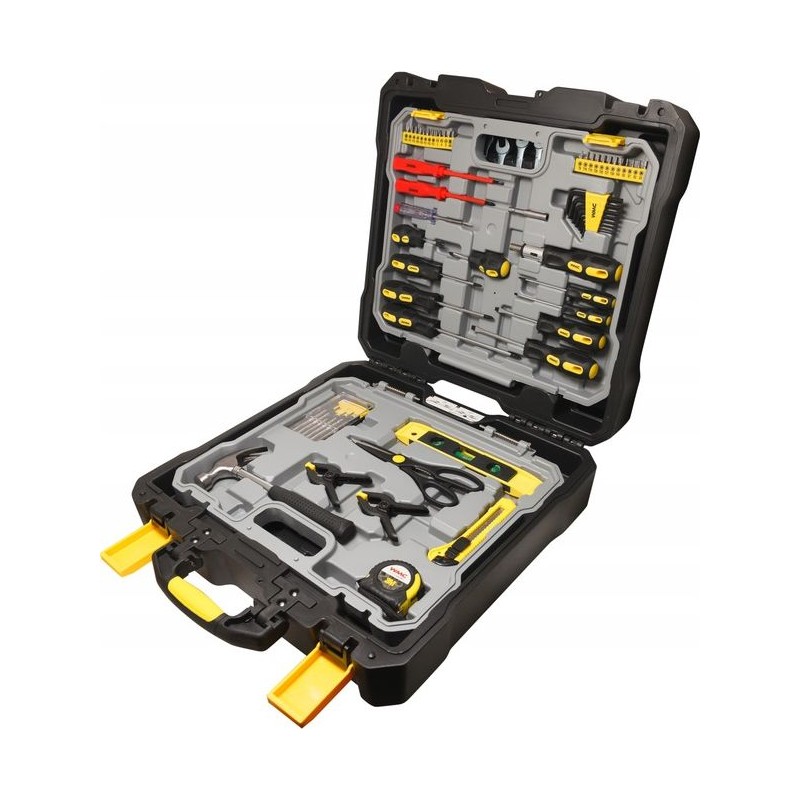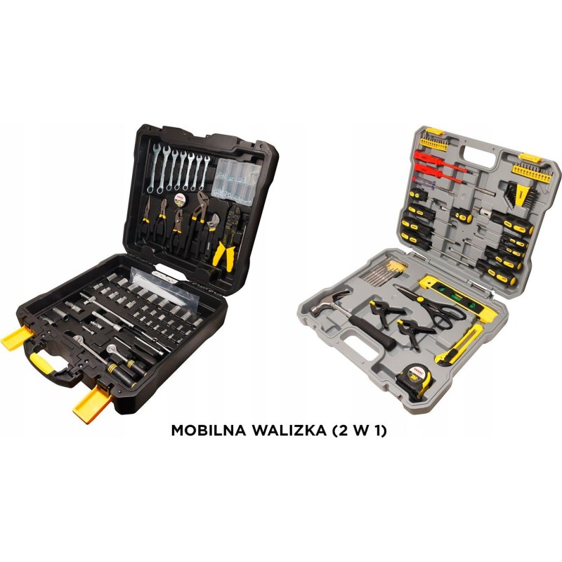 Werkzeugset im Koffer (mobiler 2-in-1-Koffer). Integrierte Rollen für einfachen Transport sowie ein Teleskopgriff. Hervorragend verarbeiteter Werkzeugkoffer. Das gesamte Set ist in solider Qualität gefertigt. Koffer mit Rollen und ausziehbarem Teleskopgriff zum Transport des Sets (wie ein Reisekoffer).