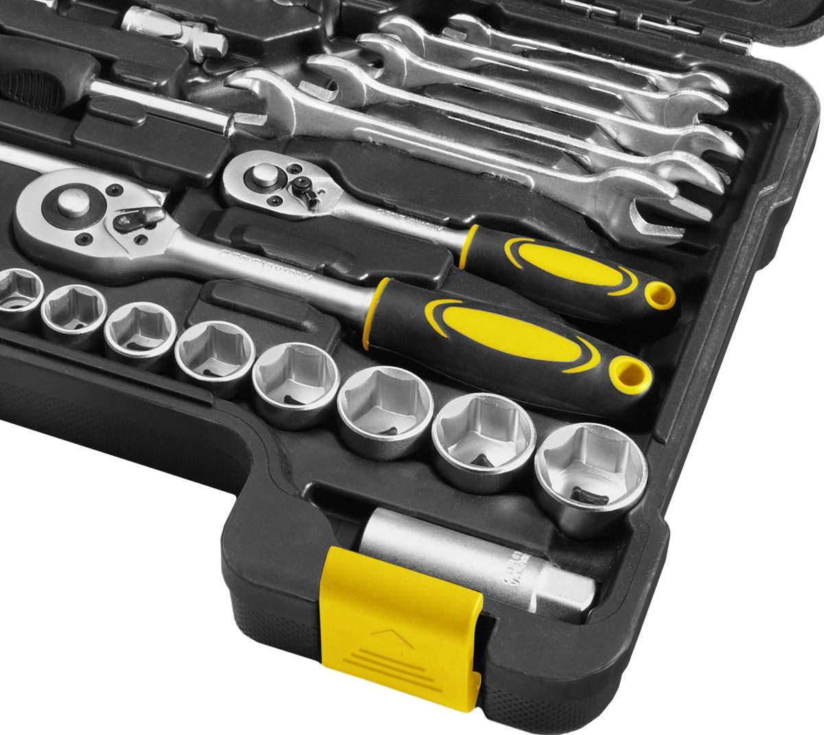 Der Werkzeugsatz besteht aus fünfundsechzig Teilen, darunter Ratschen in den Größen 1/4 und 3/8 Zoll sowie Steckschlüsseleinsätze in den Größen 7 bis 24 Millimeter in CR-V-Qualität. Ein fester Bestandteil des Sets sind Seitenschneider, verlängerte gerade Zangen sowie verstellbare Zangen. Außerdem sind hier Schraubenschlüssel- und Schraubendrehersätze enthalten. Die Werkzeuge sind in einer Kunststoffkiste untergebracht, die mit einem ergonomischen Griff ausgestattet ist, der sich nur auf einer Seite der Kiste befindet. So kann man sicher sein, dass man sie immer von der richtigen Seite öffnet und ein Herausfallen der Werkzeuge verhindert wird.