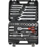 Professioneller Ratschenschlüsselsatz mit 1/2"- und 1/4"-Antrieb. Der doppelseitige Ratschenschlüssel eignet sich ideal zum Anziehen und Lösen von Schrauben an schwer zugänglichen Stellen. Der Schnellspannknopf ermöglicht einen schnellen Wechsel von Steckschlüsseleinsätzen und Bits. Der Ratschenmechanismus ist mit 72 Zähnen ausgestattet – mit einem Rastabstand von 5 Grad. Der Hebel an der Rückseite des Kopfes ermöglicht einen schnellen und reibungslosen Richtungswechsel. Der weiche, gummierte Griff sorgt für einen bequemen Halt. Alle Aufsätze sind zur leichteren Identifizierung mit einer Größenangabe versehen. Dank der übersichtlichen Anordnung aller Teile im Werkzeugkoffer ist dieses Set leicht zu transportieren.