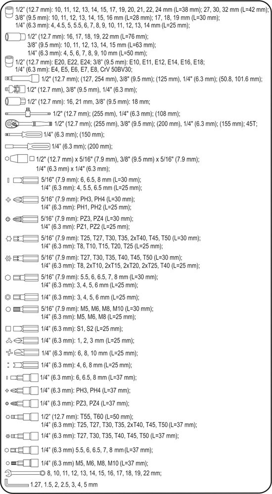 • 3/8"-Steckschlüsseleinsätze: 10; 11; 12; 13; 14; 15; 16; 17; 18; 19 mm,