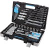 1/2"-Ratschengriff 72 T 1/4"-Ratschengriff 72 T 1/4"-Schraubendreher für Steckschlüsseleinsätze 1/4"-Sechskant-Steckschlüsseleinsätze 4, 5, 6, 7, 8, 9, 10, 11, 12, 13 mm 1/4"-Langsteckschlüssel 6, 7, 8, 10, 13 mm 1/2"-Sechskantsteckschlüssel 13, 14, 15, 16, 17, 18, 19, 21, 22, 24 mm 1/2"-Langsteckschlüssel 17, 19, 21, 22 mm 1/2"-Zündkerzensteckschlüssel 16, 21 mm 1/2"-Verlängerungen 125 mm 1/4"-Verlängerung 75 mm 1/4"-Gelenk für Teleskopgriff 1/2"-Universalgelenk 1/4"-Universalgelenk 1/2" - 1/4" Adapter für Bits 1/4" Gelenk für Teleskopgriff Ring-Maulschlüssel 6, 8, 10, 11, 13, 14, 15, 17, 19 mm Sechskantschlüssel (Inbusschlüssel) 1,5, 2, 2,5, 3, 4, 5, 6, 8, 10 mm 1/4"-Bits: flach: 3, 4, 5, 6 mm; HEX: 4, 5, 6 mm; PZ 1, 2, 3; PH 1, 2, 3 – je 2 Stück pro Größe; TORX T25, T27, T30, T35 Bits 3/8": flach: 5, 6 mm; PH 1, 2, 3; PZ 1, 2, 3; TORX T25, T27, T30, T35