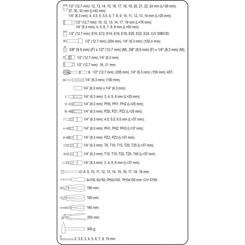 • Die Werkzeuge wurden präzise aus Materialien gefertigt, die ihre Zuverlässigkeit gewährleisten. Das Set enthält eine vollständige Auswahl an langen und kurzen Steckschlüsseleinsätzen in den Größen 1/4", 3/8" und 1/2", Verlängerungen, Kardangelenke und viele weitere Teile, darunter Ratschen mit 45 Zähnen.