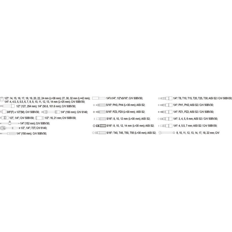 Das Set enthält insgesamt mehrere Dutzend Werkzeuge für den universellen Einsatz – neben den Schraubenschlüsseln erhalten Sie außerdem Steckschlüsseleinsätze, Ratschen, Drehknöpfe, Schraubendrehereinsätze und Verlängerungen. Mit ihnen können Sie zahlreiche Arbeiten an Geräten und Maschinen durchführen, die auf Gewindeverbindungen mit verschiedenen Nennweiten basieren. Alle Werkzeuge sind aus robusten Materialien gefertigt, die eine sehr hohe Belastbarkeit garantieren – in dieser Hinsicht gibt es kaum bessere Modelle.