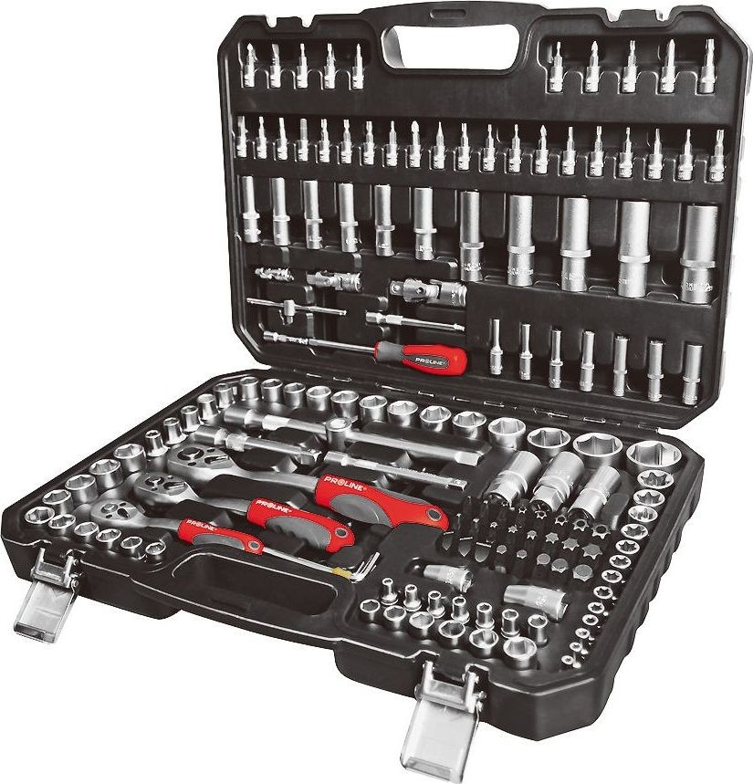Der Steckschlüsselsatz der Marke Proline mit der Artikelnummer 588150 eignet sich ideal für die Werkstatt und den Hausgebrauch. Jeder Steckschlüssel ist aus Chrom-Vanadium-Stahl gefertigt, während die Schlüsselsätze verchromt und poliert sind. Alle 150 Teile wurden aus widerstandsfähigem CrV-Kohlenstoffstahl mit einem hohen Kohlenstoffgehalt hergestellt, um eine hohe Härte im gesamten Querschnitt des Werkzeugs zu gewährleisten. In einem relativ kleinen Koffer (Länge: 34 cm, Breite: 47 cm, Höhe: 11 cm) finden sich die meisten Werkzeuge, die wir für Werkstatt- und Heimarbeiten benötigen. Die Steckschlüsseleinsätze sind gerändelt, und die präzise Ratsche mit Zweikomponenten-Griff verfügt über 72 Zähne. Das Steckschlüsselset 588150 wird in einem soliden und robusten Kunststoffkoffer mit Scharnieren, Metallklammern und einem praktischen Tragegriff geliefert.