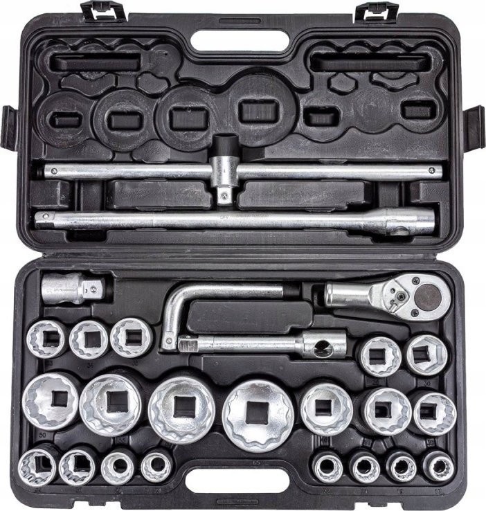 • 12-Kant-Steckschlüsseleinsätze 3/4" – 17 Stück: 17 mm, 19 mm, 21 mm, 22 mm, 24 mm, 27 mm, 30 mm, 32 mm, 33 mm, 34 mm, 35 mm, 36 mm,(36 mm – 12-kant), 38 mm, 41 mm, 46 mm, 50 mm