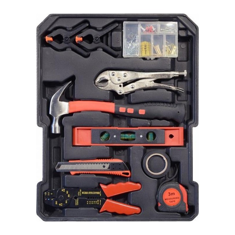 2x Nylon-Universalklemme 1x Hammer 1x selbstsichernde Zange 180 mm 1x Verbindungszange 200 mm 1x Maßband 3 m 1x Wasserwaage 220 mm 1x Isolierband 1x Messer 70x Verbindungselemente